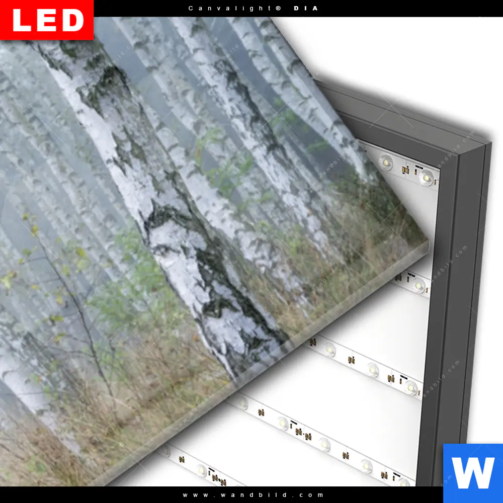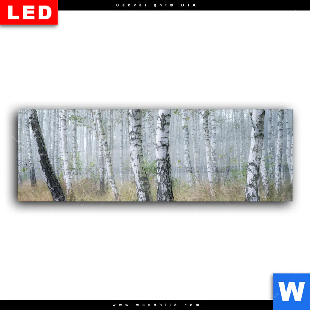 Wechselmotiv Acrylglas Canvalight® DIA | Nebliger Morgen im Birkenwald | Panorama