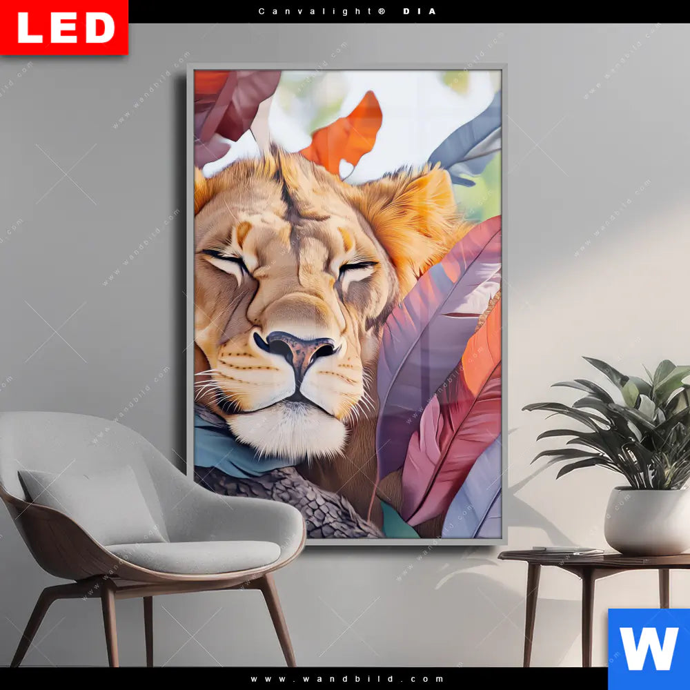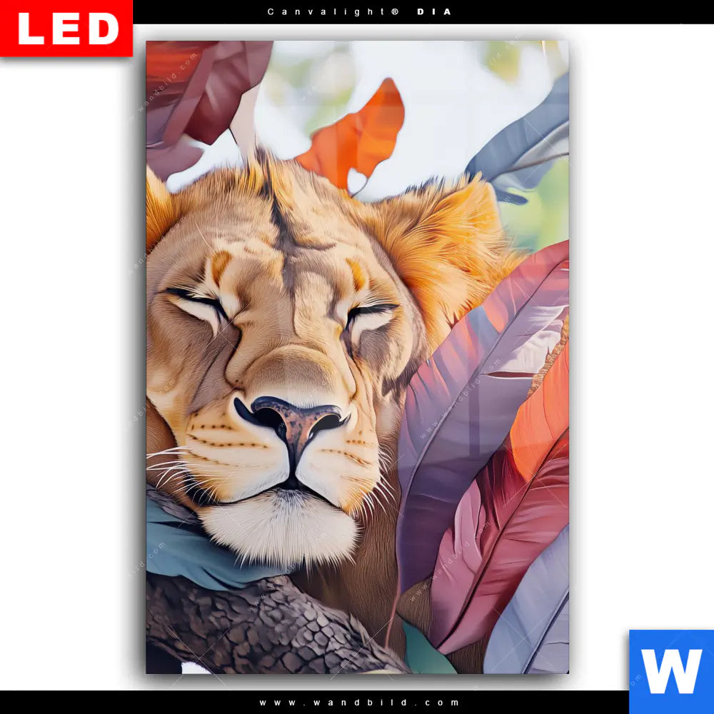 Wechselmotiv Acrylglas Canvalight® DIA | Träumender Löwe im Baum | Hochformat