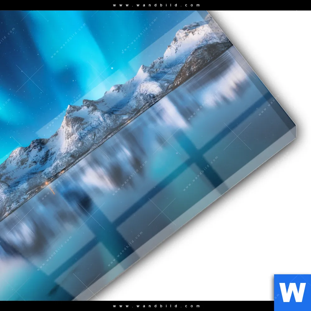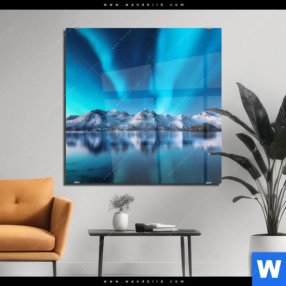 Acrylglasbild | Nordlichter und schneebedeckte Berge | Quadrat