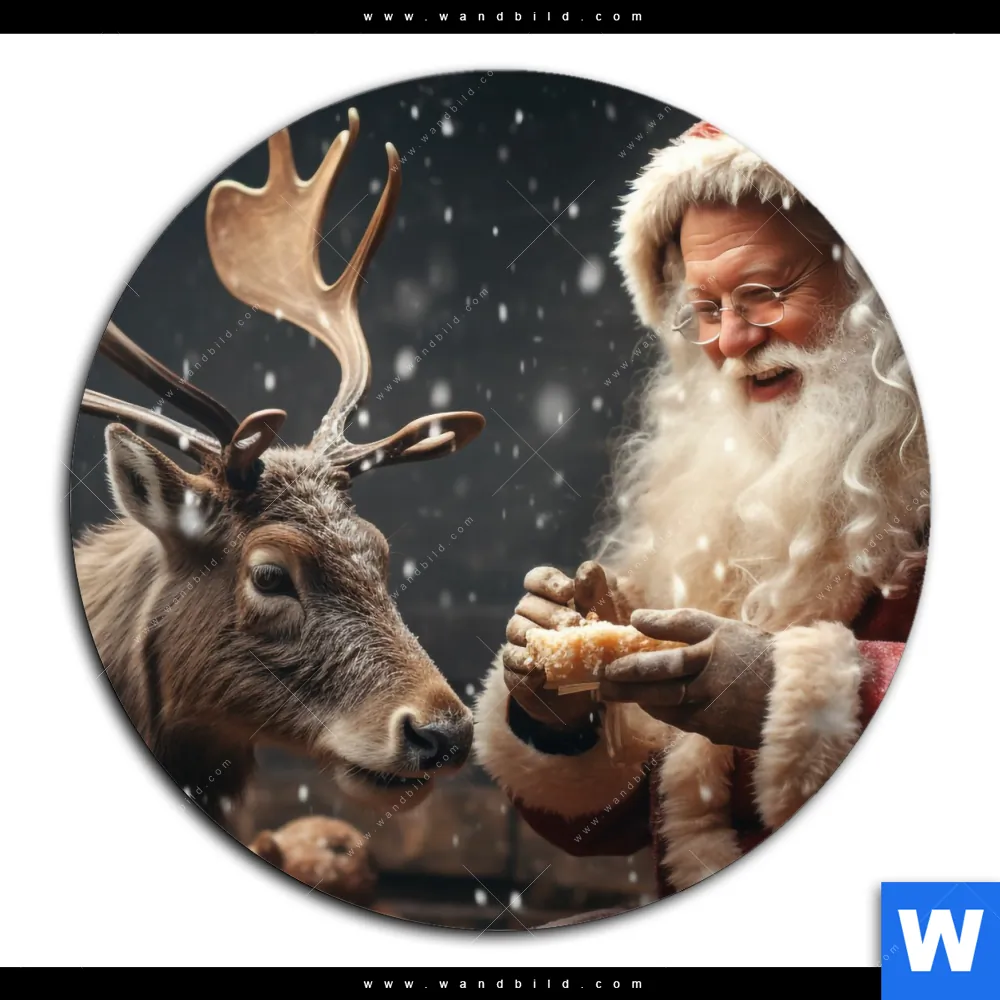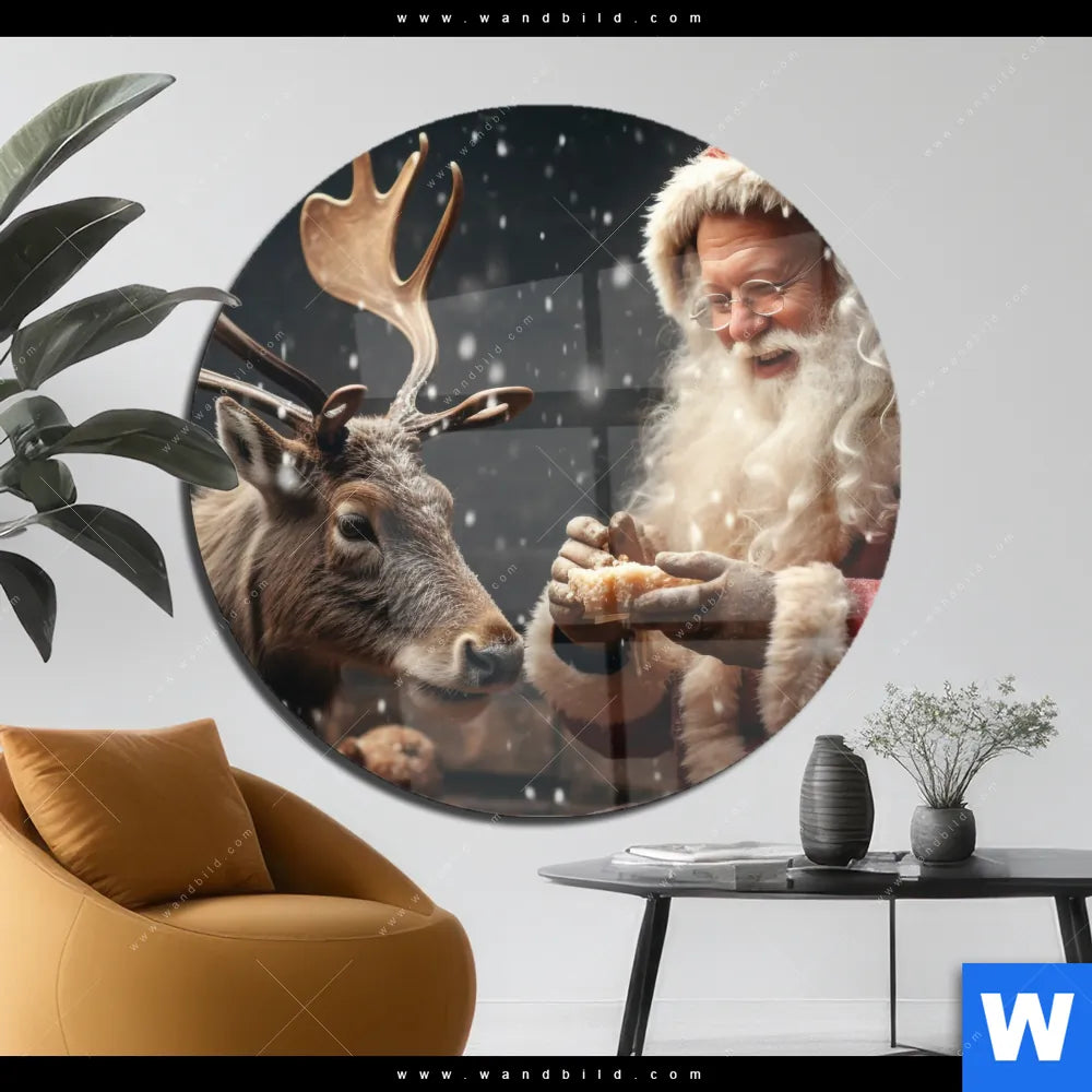Acrylglasbild | Weihnachtsmann füttert Rentier | Rund