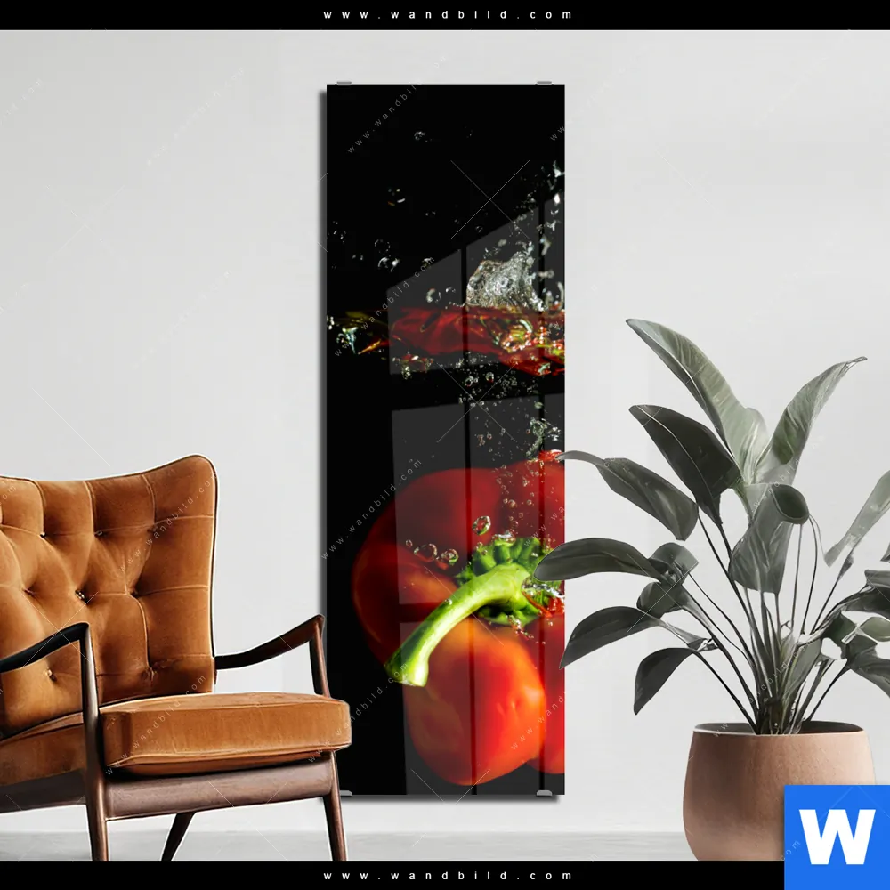 Acrylglasbild | Spritzer von Paprika beim fallen ins Wasser | Schmal