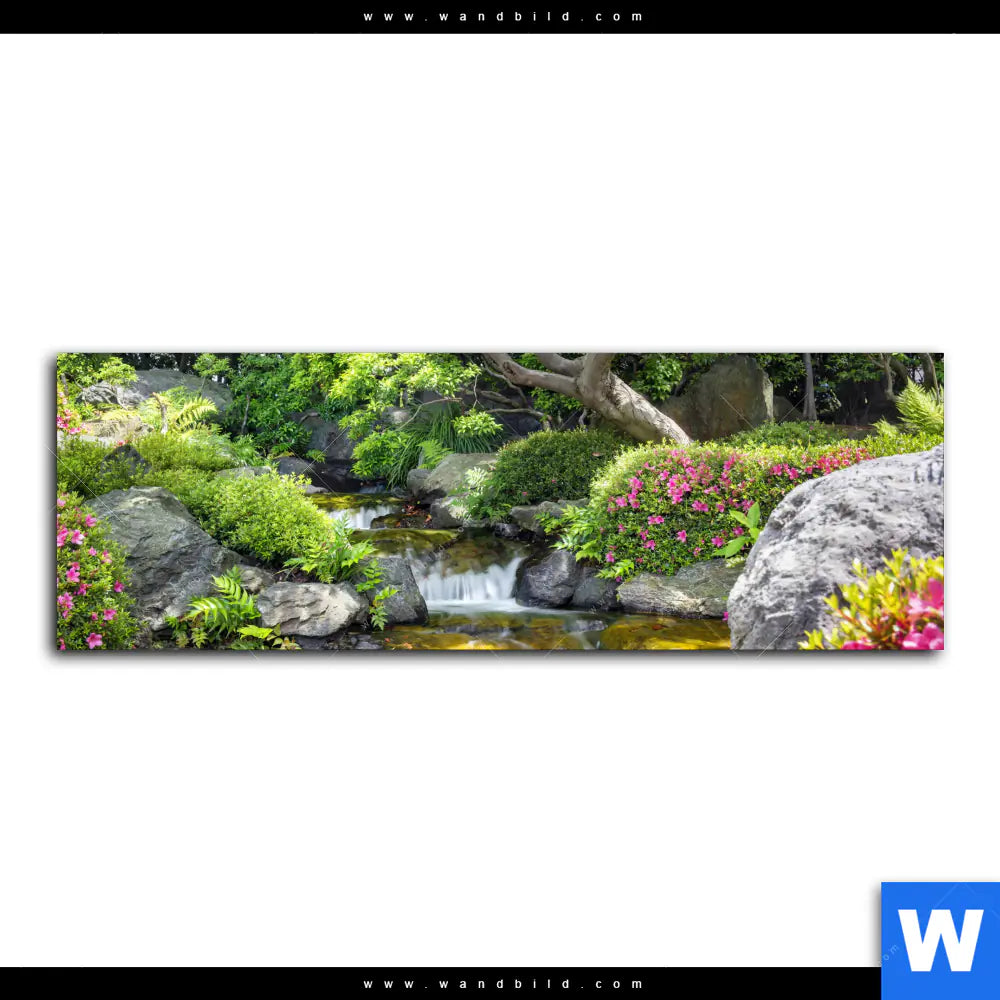 Aluminiumbild gebürstet | Japanischer Garten mit Wasserlauf | Panorama