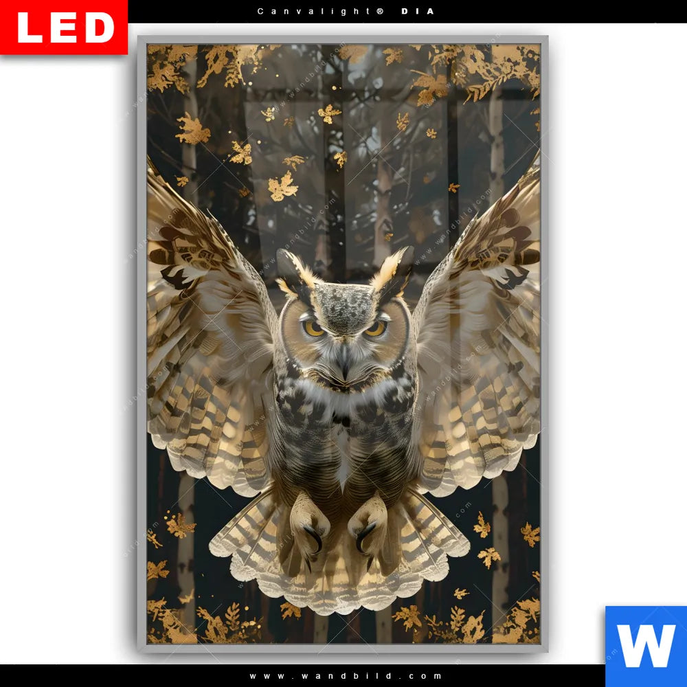Canvalight® DIA Leuchtbild | Eule inmitten goldener Blätter | Hochformat