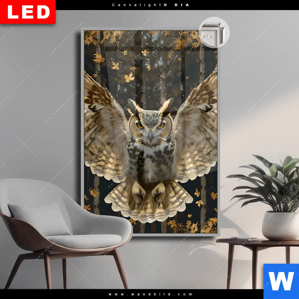 Leuchtbild Acrylglas Canvalight® DIA | Eule inmitten goldener Blätter | Hochformat