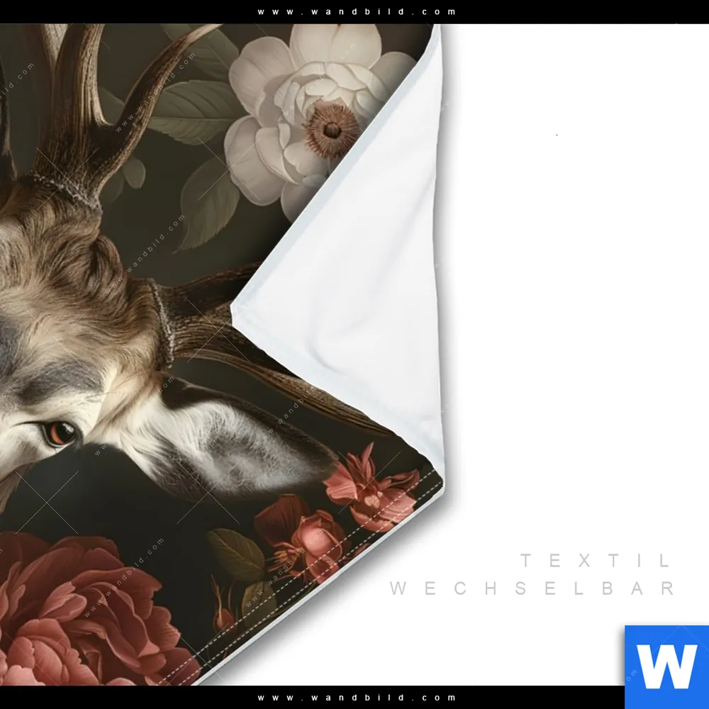 Wechselmotiv Textil | Friedlicher Hirsch und Blüten | Hochformat