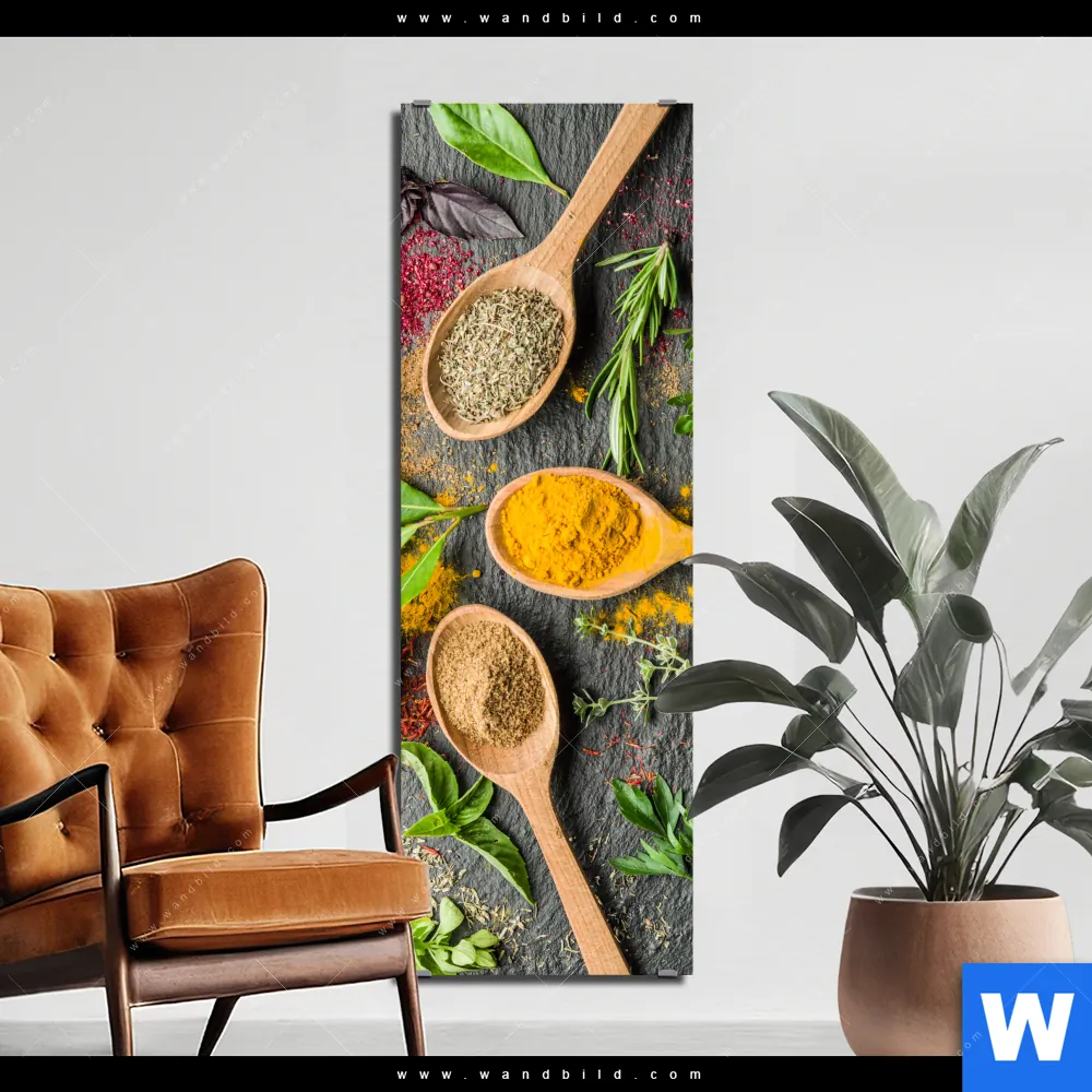 Alu-Dibond Bild | Bunte Gewürze in Holzlöffeln | Schmal