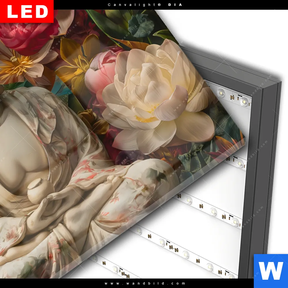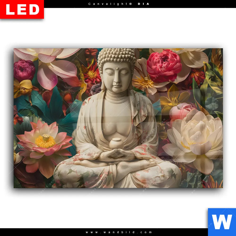 Wechselmotiv Acrylglas Canvalight® DIA | Buddha in farbenfrohen Blumen | Querformat