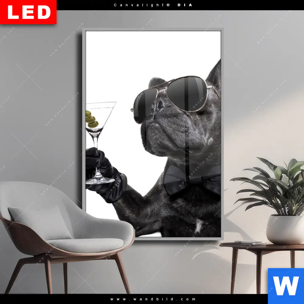 Wechselmotiv Acrylglas Canvalight® DIA | Bulldogge mit Martini | Hochformat