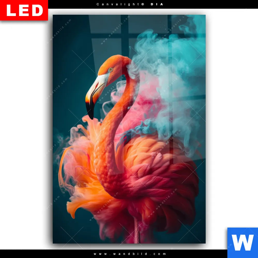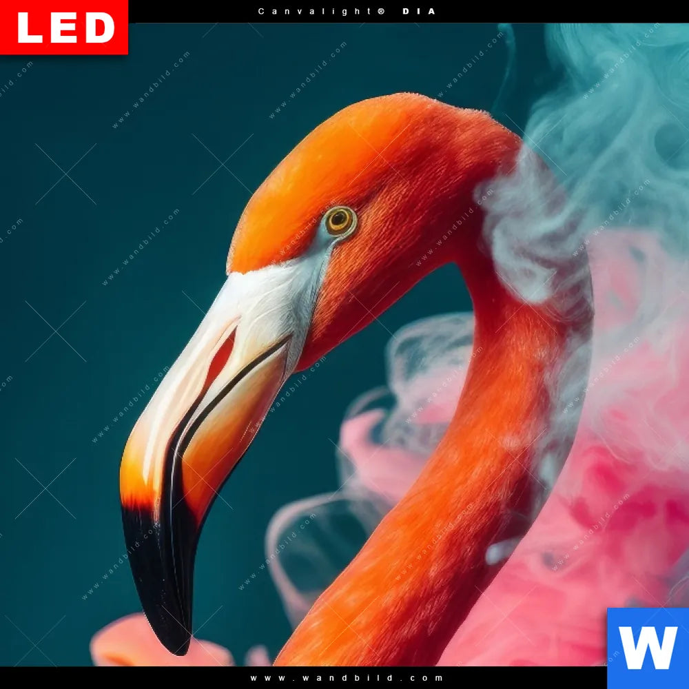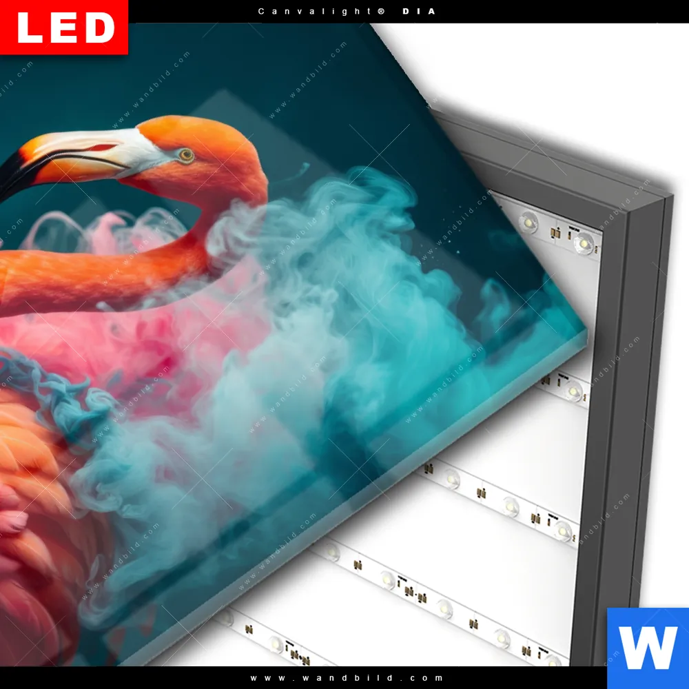 Wechselmotiv Acrylglas Canvalight® DIA | Flamingo in bunter Rauchwolke | Hochformat