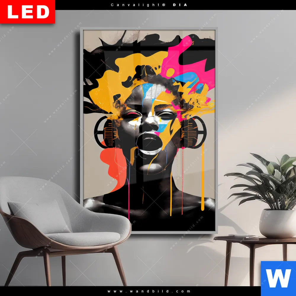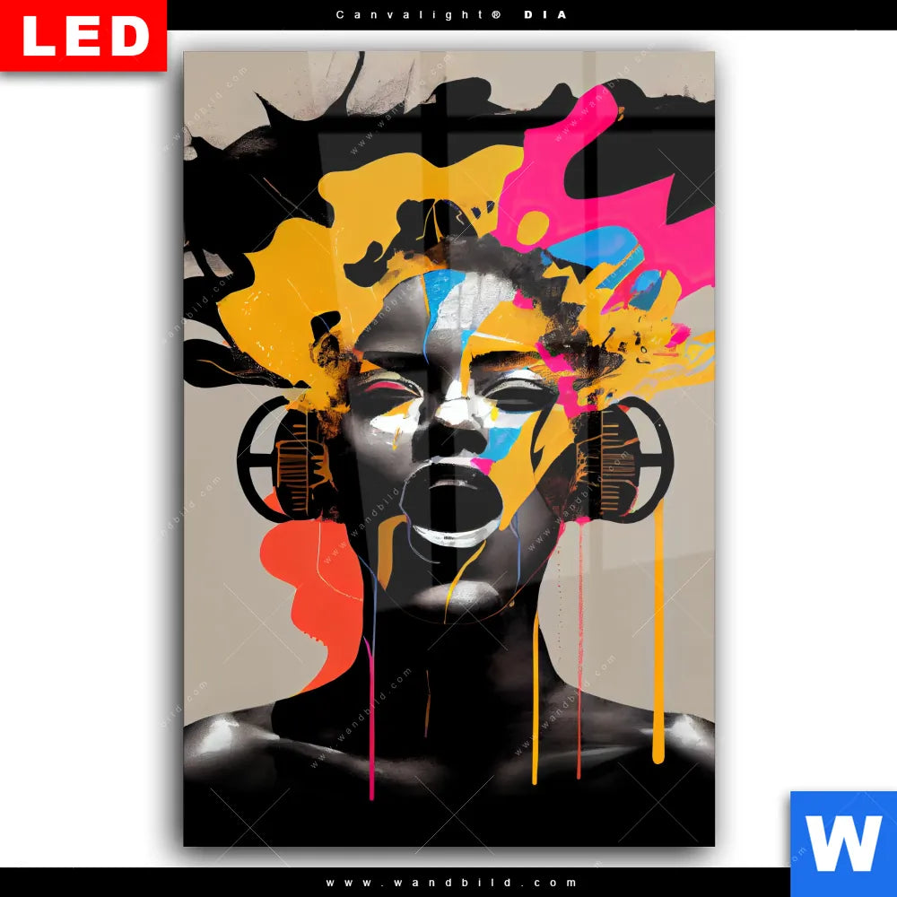 Wechselmotiv Acrylglas Canvalight® DIA | Frau mit Kopfhörern | Hochformat