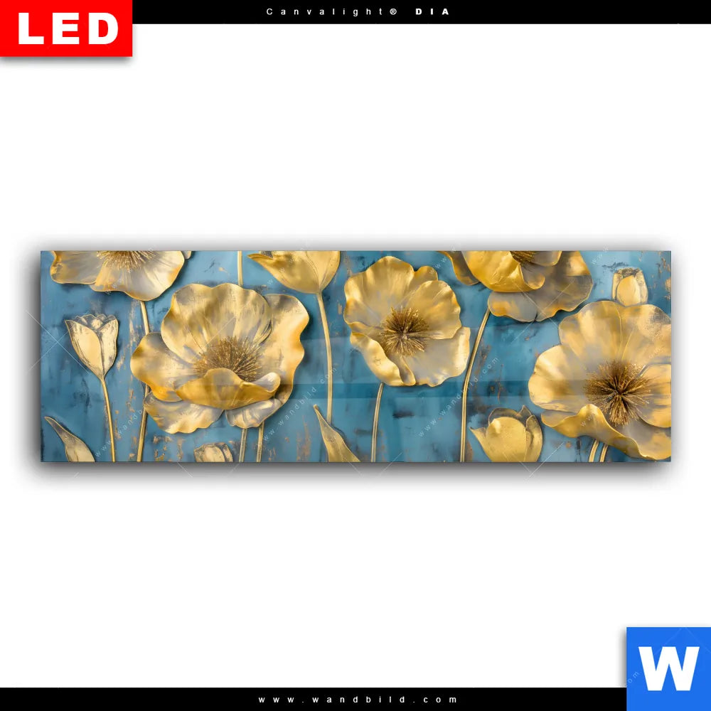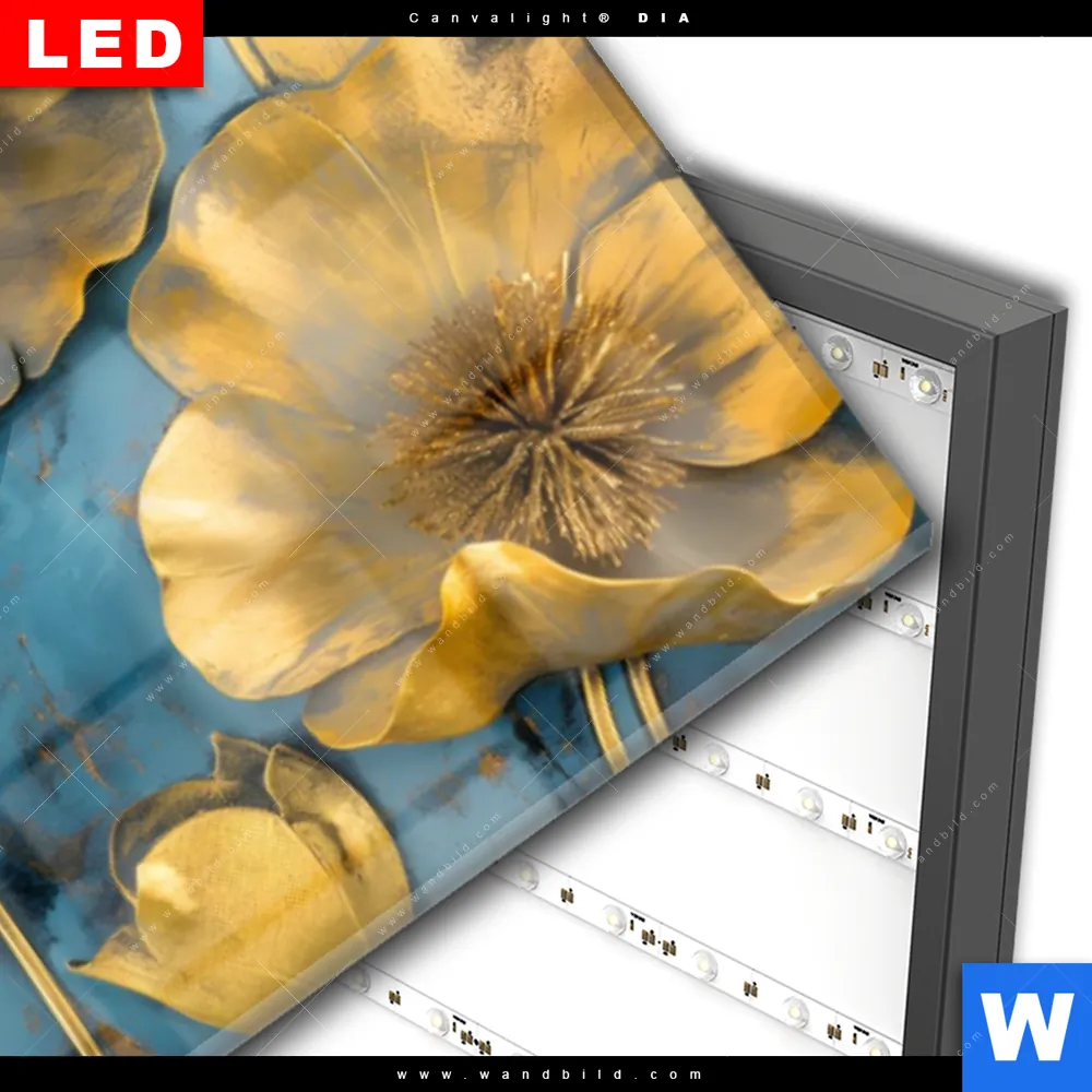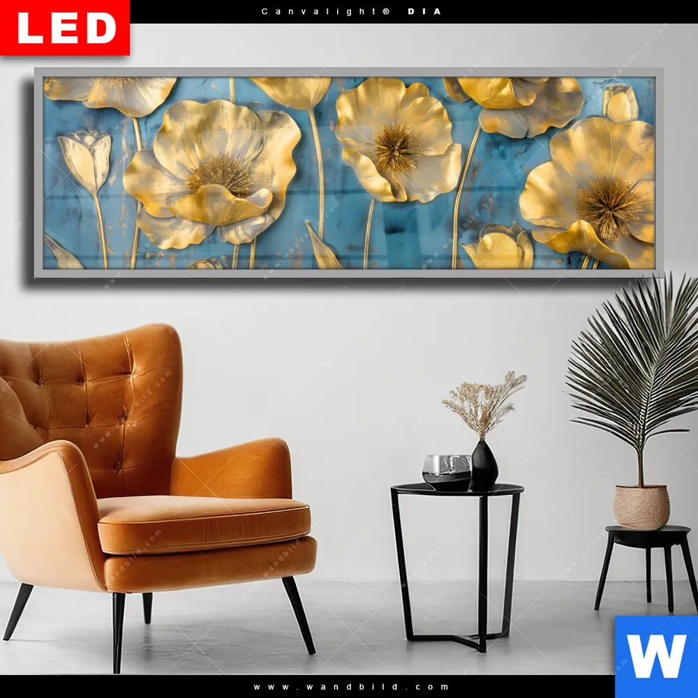 Wechselmotiv Acrylglas Canvalight® DIA | Goldene Blumen auf Blau | Panorama