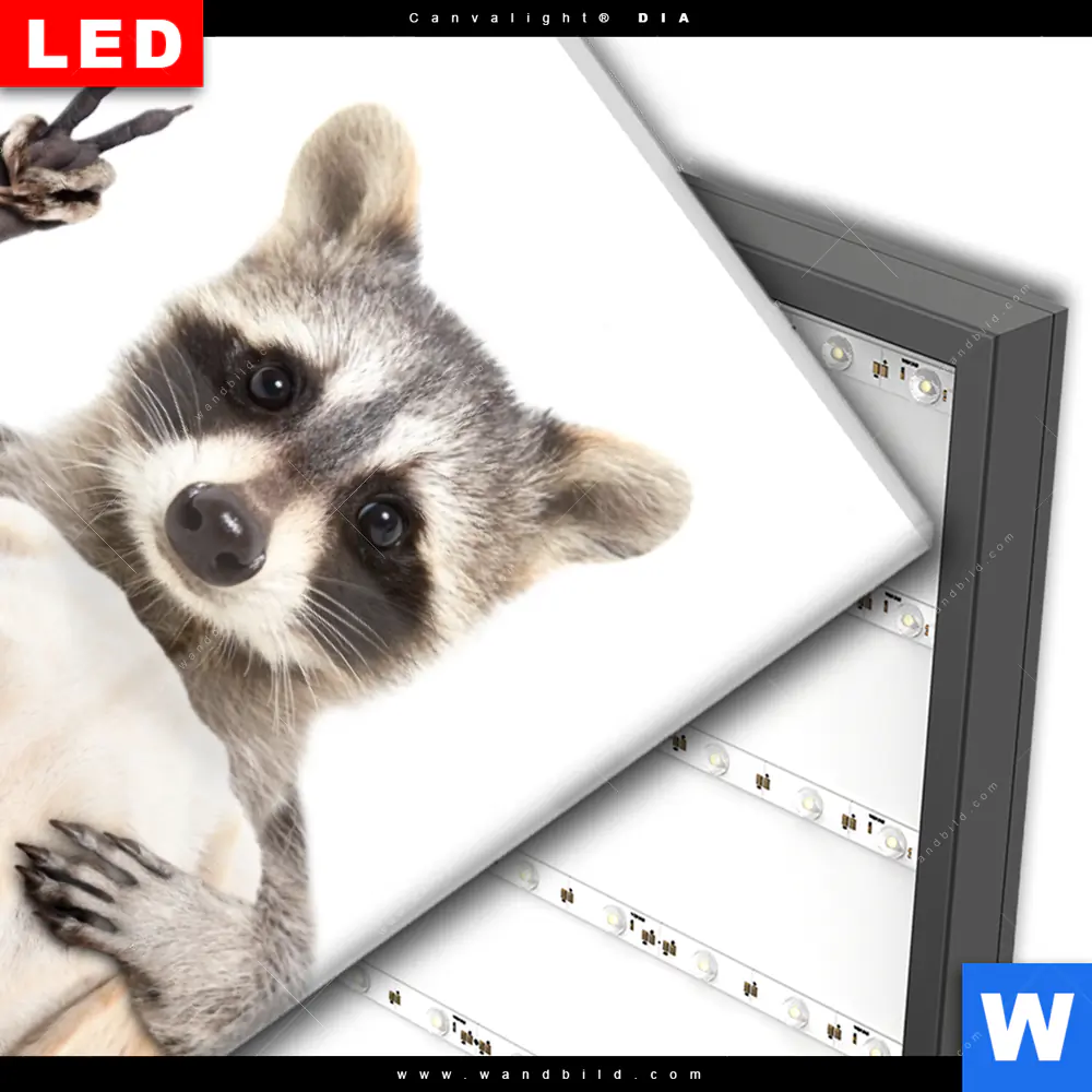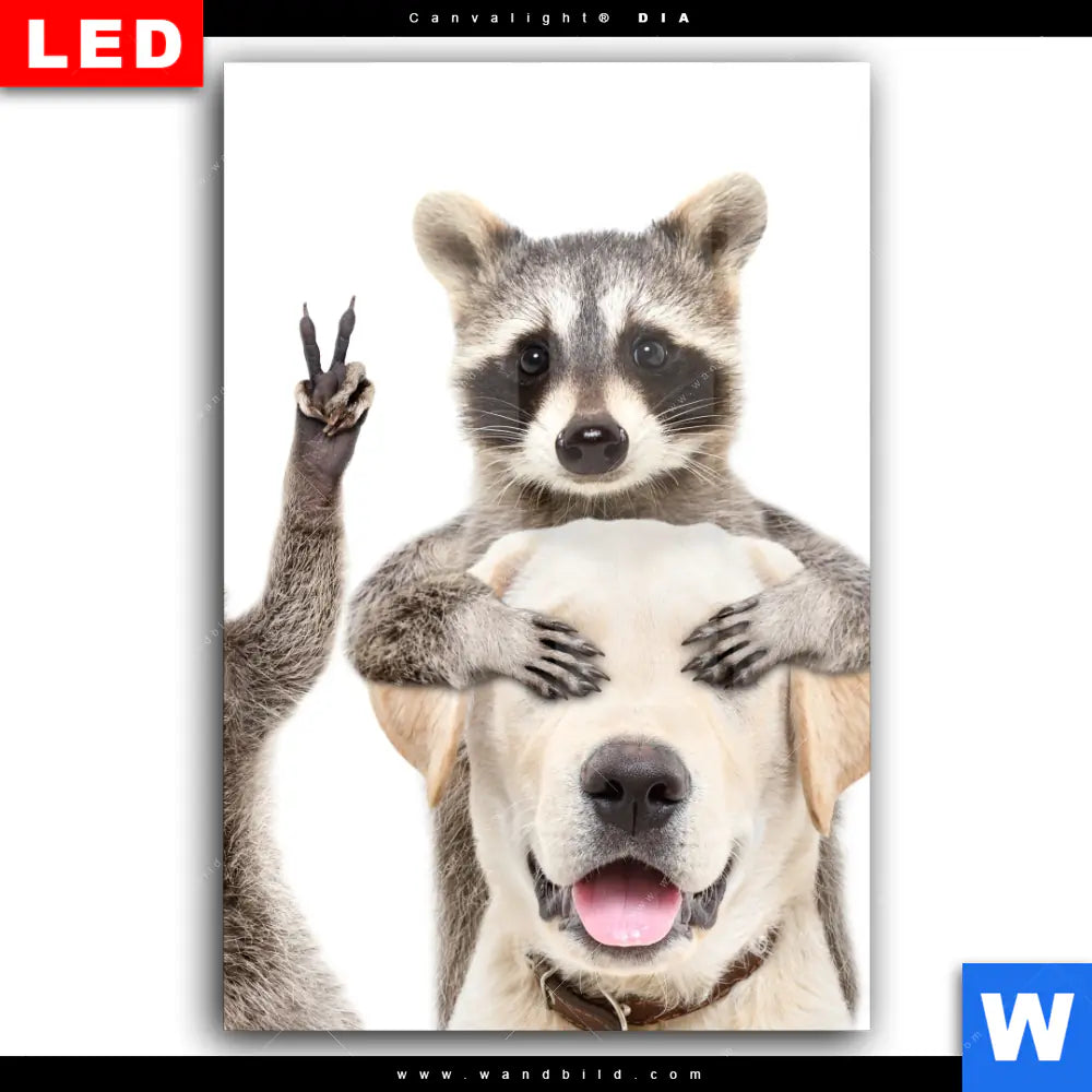 Wechselmotiv Acrylglas Canvalight® DIA | Lustige Waschbären mit Hund | Hochformat