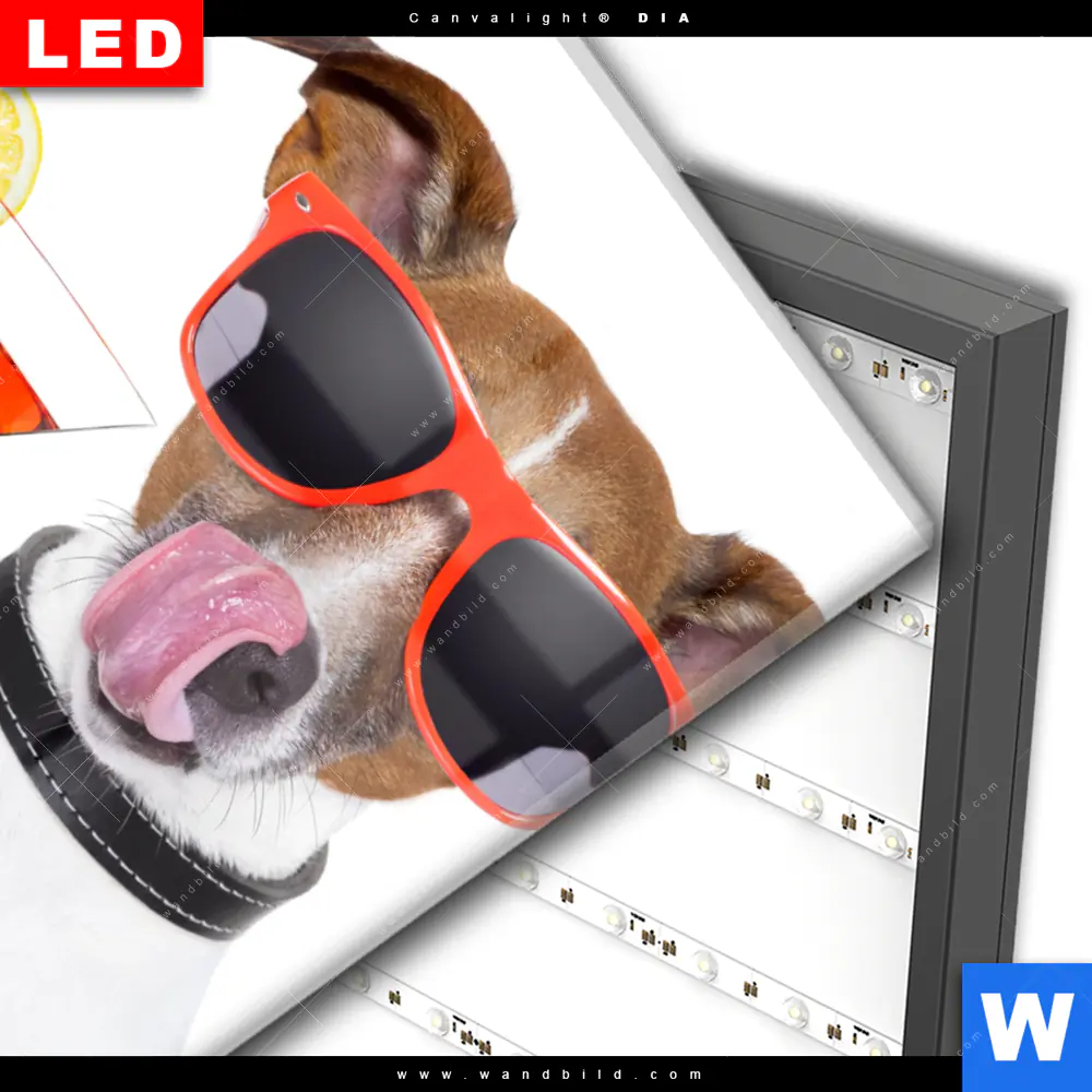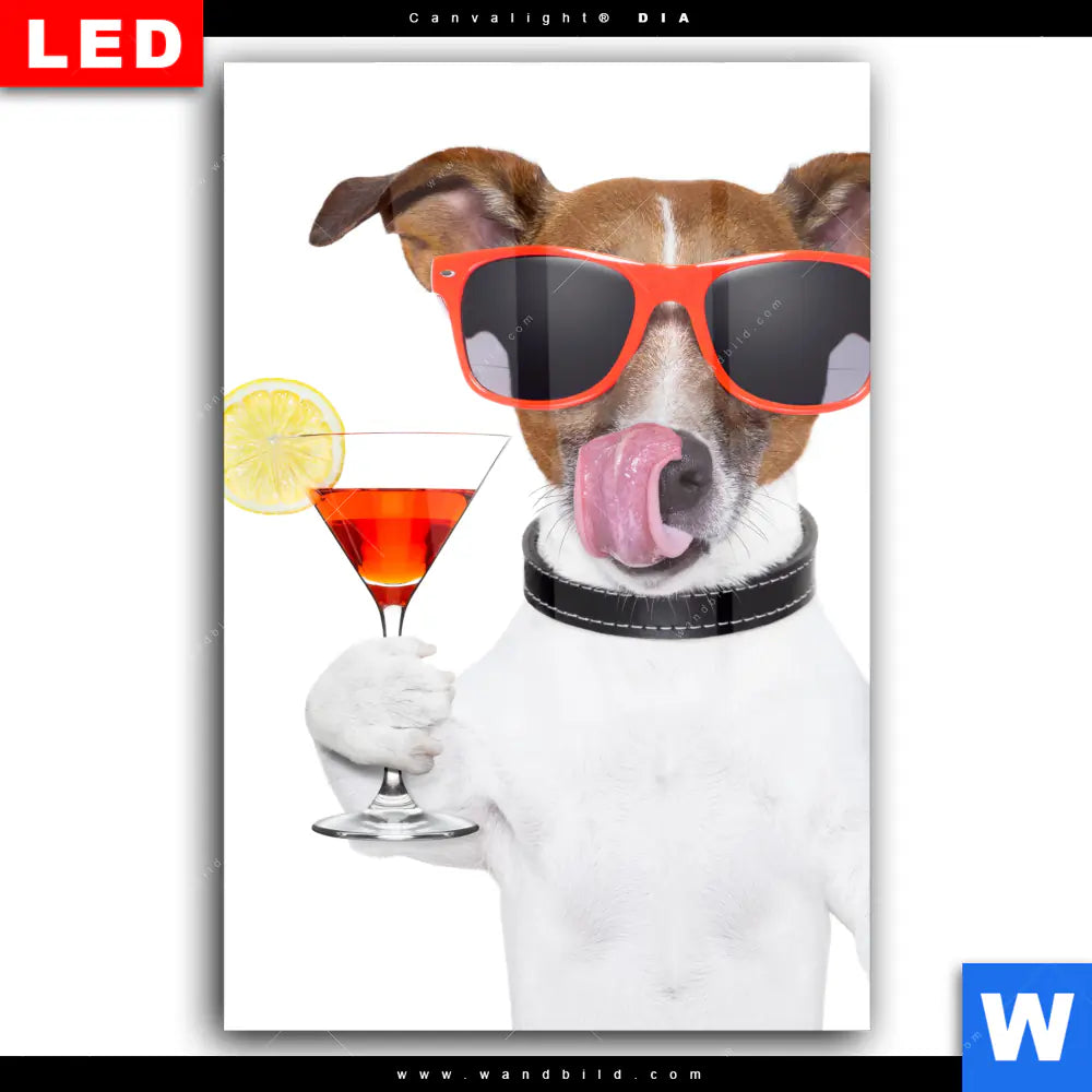 Wechselmotiv Acrylglas Canvalight® DIA | Lustiger Hund mit Drink | Hochformat