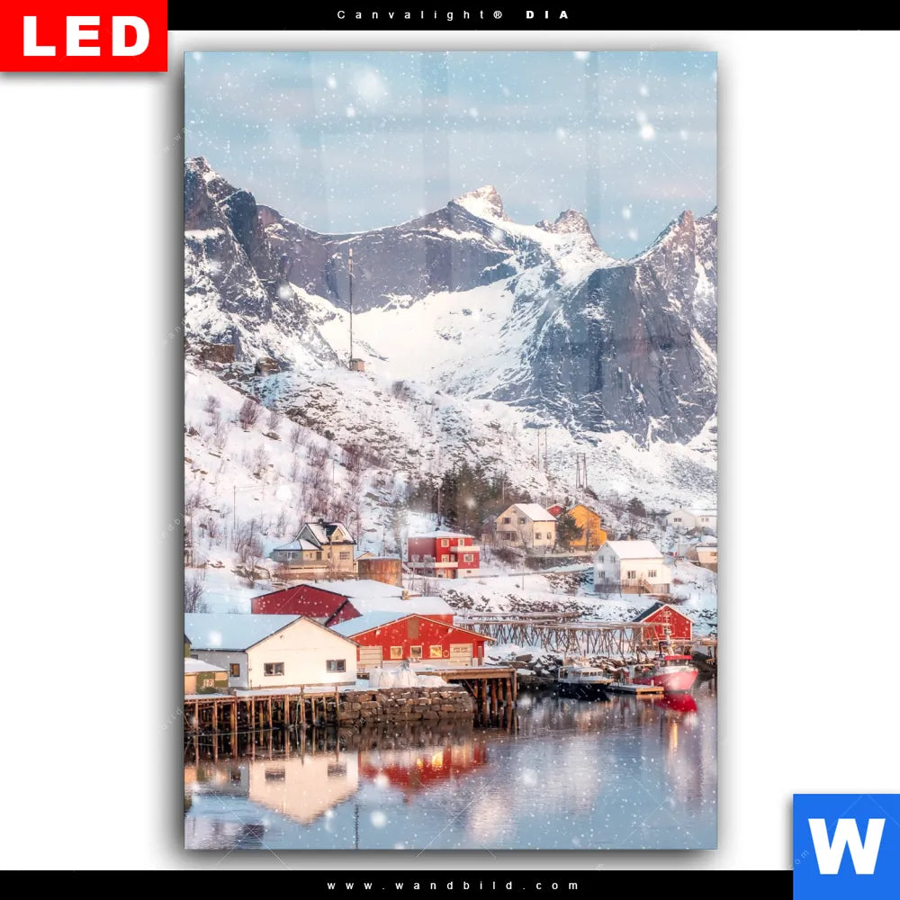 Wechselmotiv Acrylglas Canvalight® DIA | Skandinavisches Dorf im Schnee | Hochformat