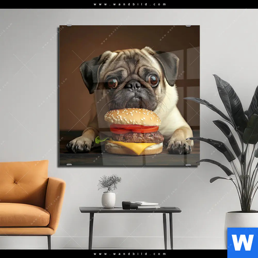 Acrylglasbild | Mops mit Cheeseburger | Quadrat