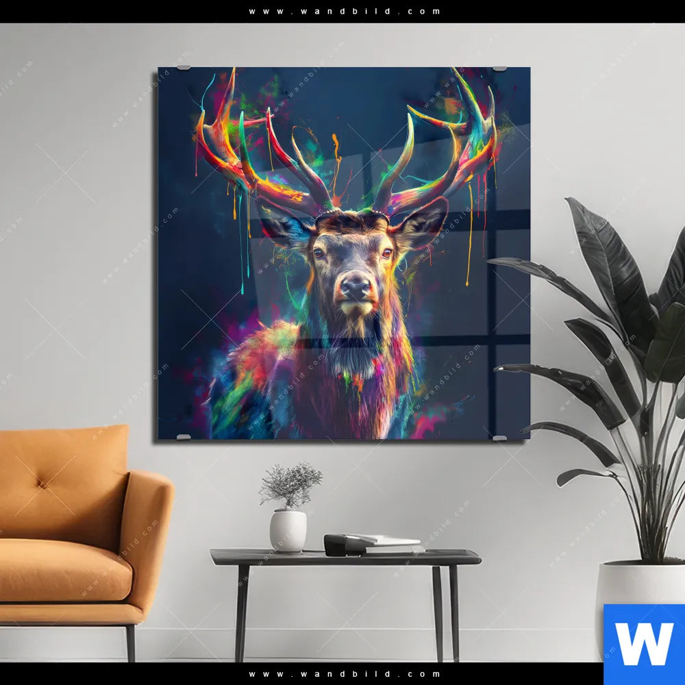 Acrylglasbild | Hirsch im leuchtenden Farbmix | Quadrat