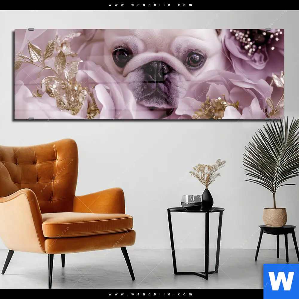 Acrylglasbild | Mops im Blütenmeer | Panorama