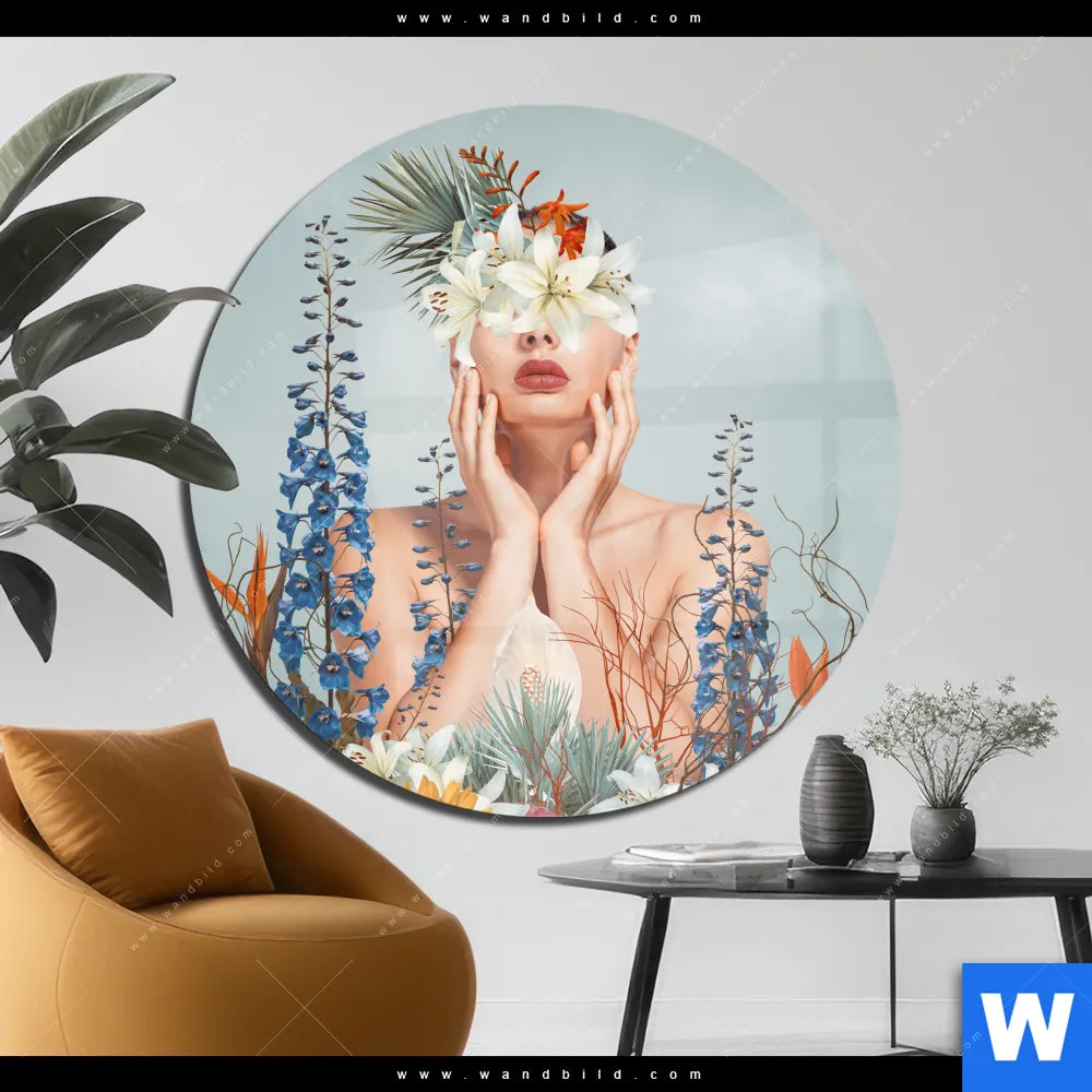 Acrylglasbild | Frauenportrait mit Blumen | Rund