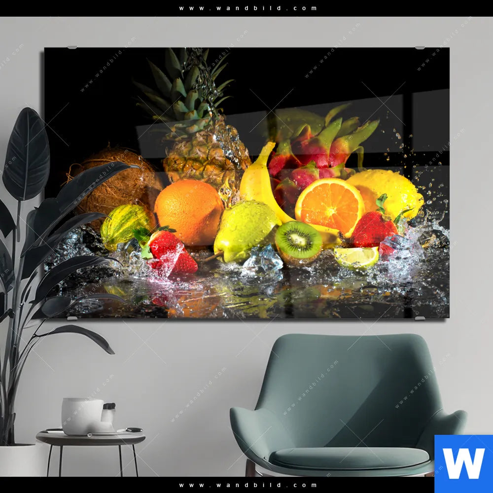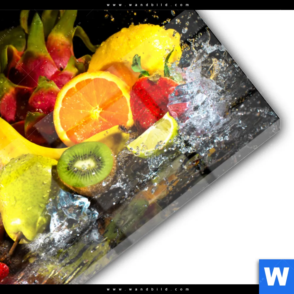 Acrylglasbild | Obst-in spritzendem Wasser | Querformat