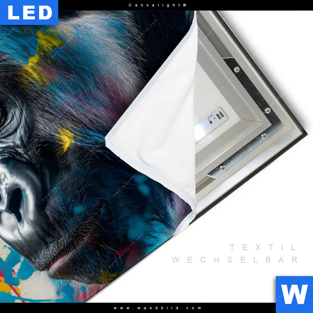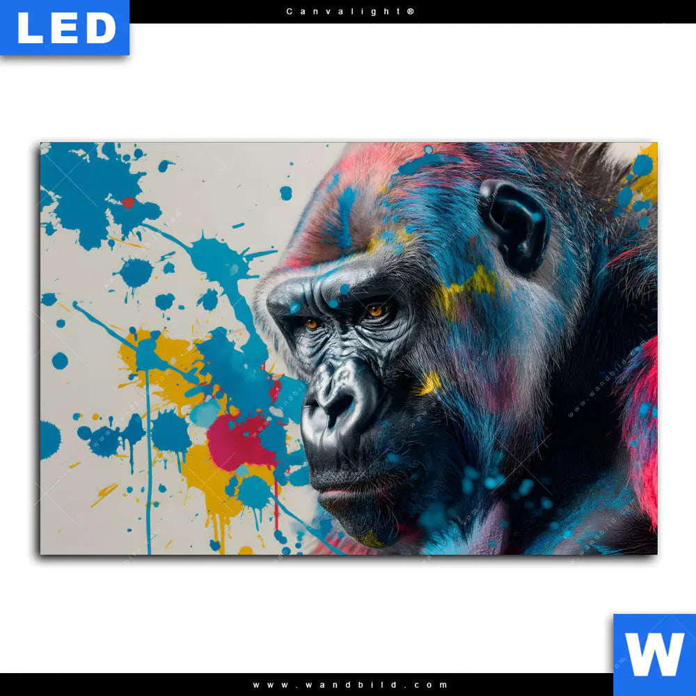 Canvalight® TEX Leuchtbild | Bunter Gorilla mit Farbspritzern | Querformat
