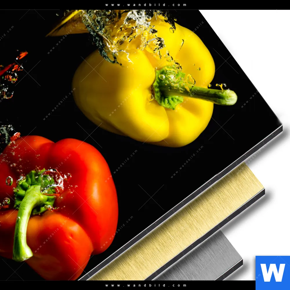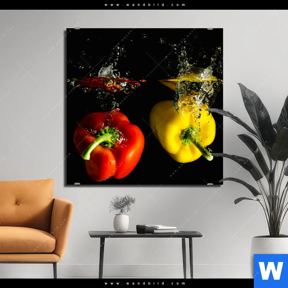 Alu-Dibond Bild | Spritzer von Paprika beim fallen ins Wasser | Quadrat