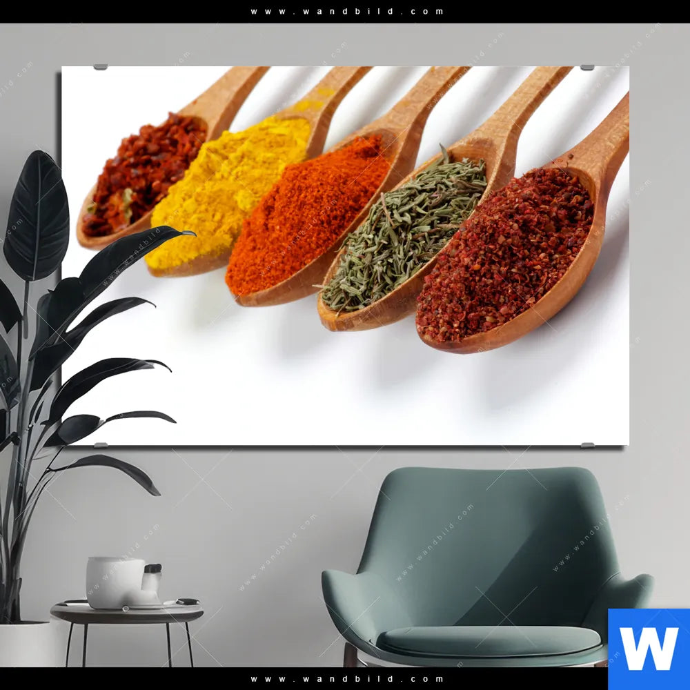 Alu-Dibond Bild | Farbige Gewürze auf Holzlöffel | Querformat
