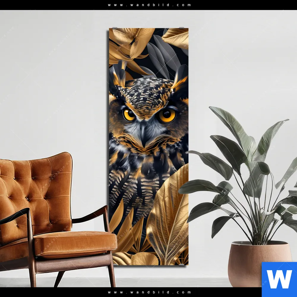 Alu-Dibond Bild | Eule und goldene Blätter | Schmal