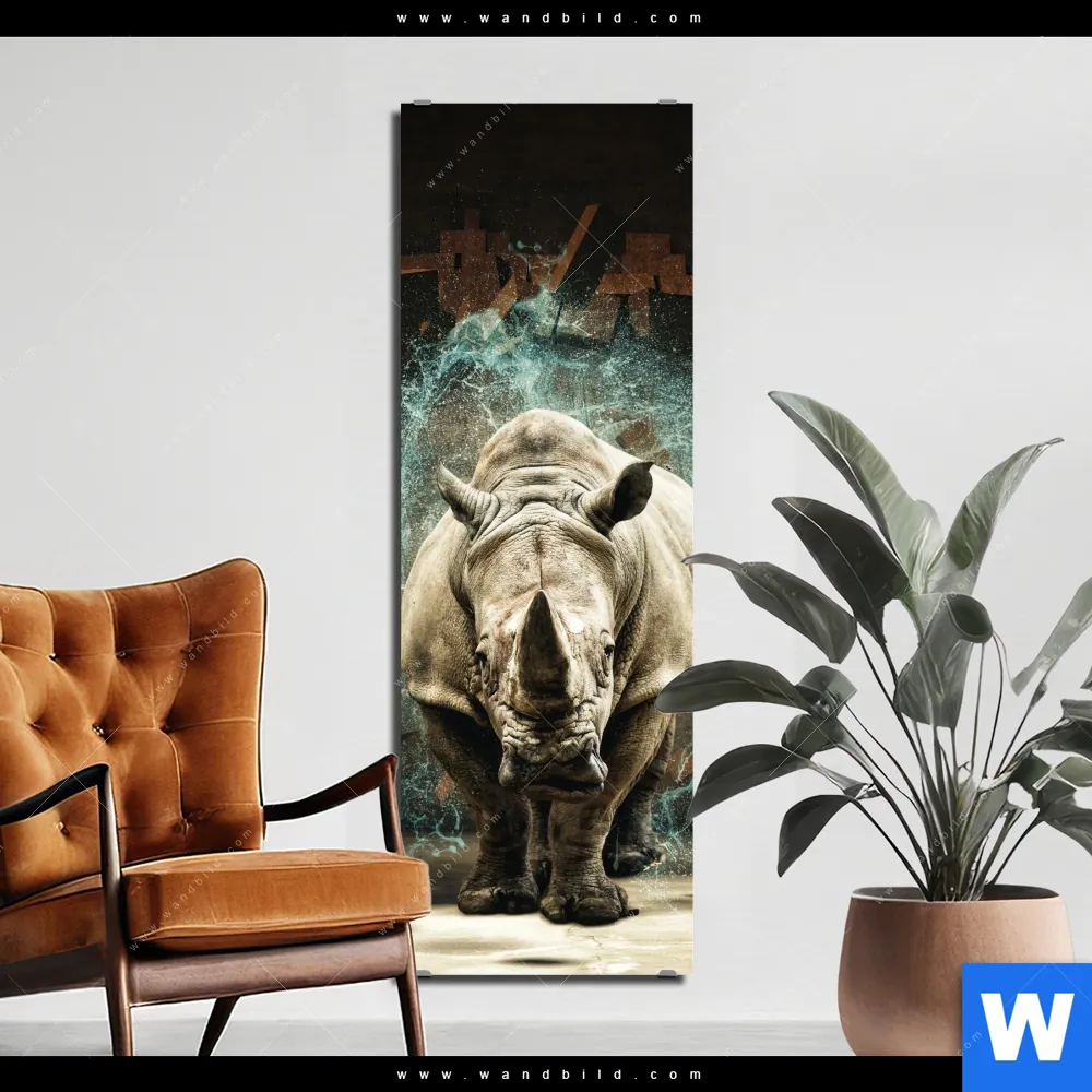 Alu-Dibond Bild | Nashorn zerstört Wand | Schmal