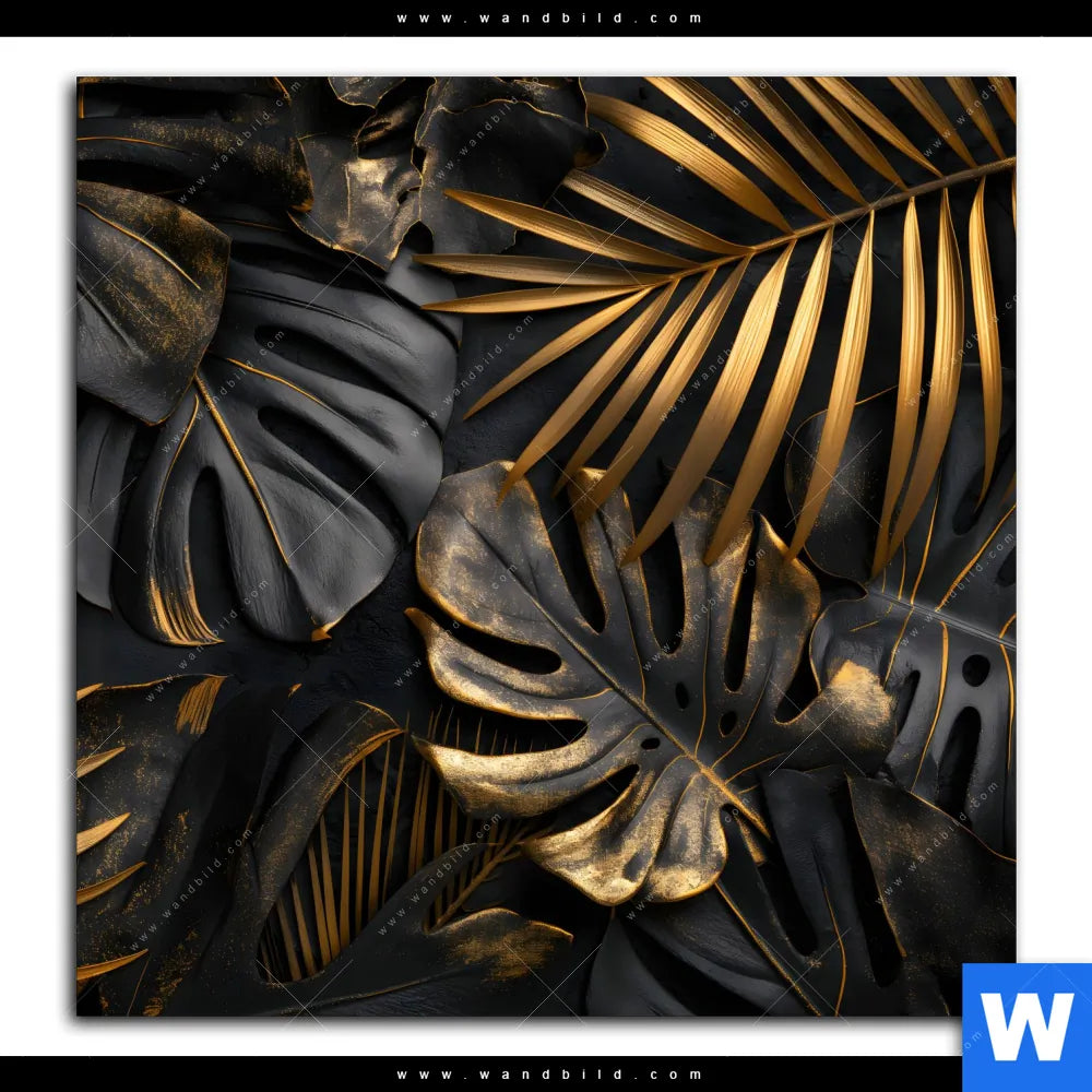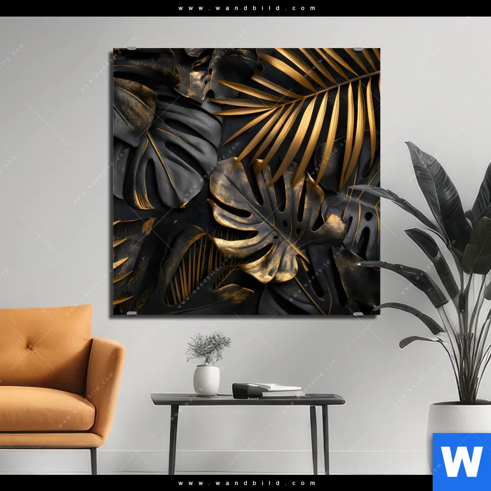 Alu-Dibond Bild | Palmenblätter Schwarz Gold | Quadrat