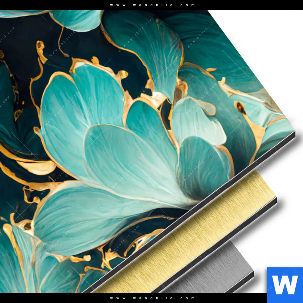 Aluminiumbild gebürstet | Marmor Blüten in türkis & gold | Hochformat