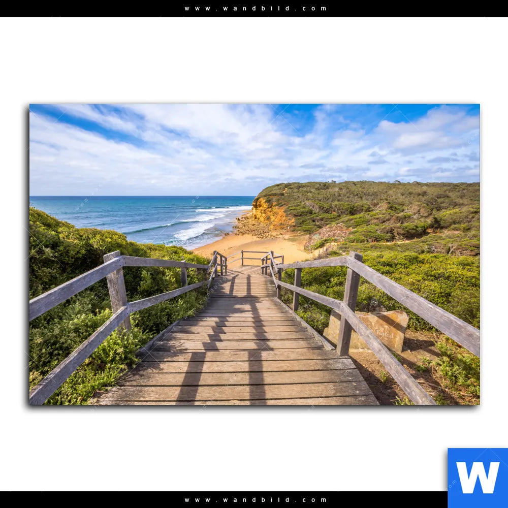 Aluminiumbild gebürstet | Holztreppe zum einsamen Strand | Querformat