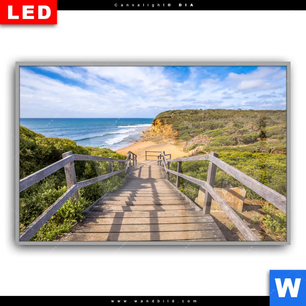 Canvalight® DIA Leuchtbild | Holztreppe zum einsamen Strand | Querformat