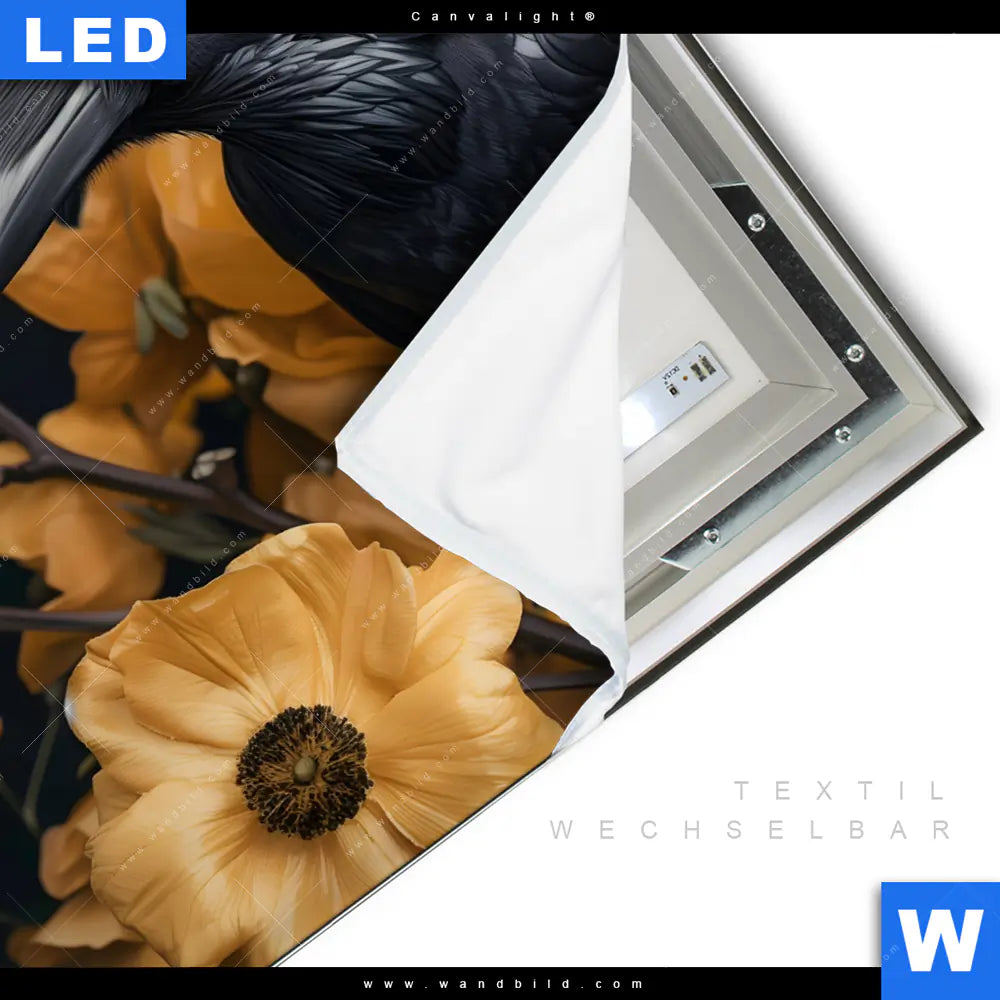 Canvalight® TEX Leuchtbild | Naturbild - Rabe & Blüten | Quadrat