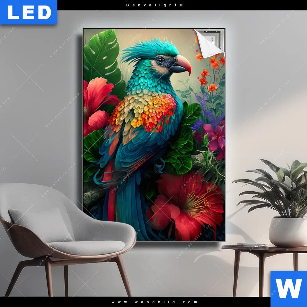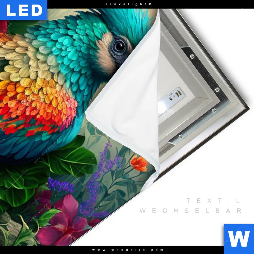 Canvalight® TEX Leuchtbild | Papagei und tropischer Hibiskus | Hochformat