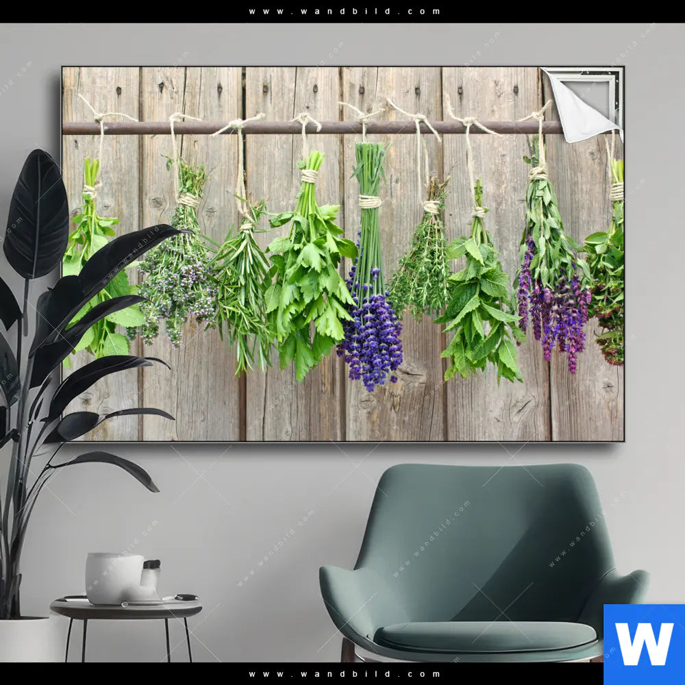 Spannbild | Frische Kräuter an Holzstange | Querformat