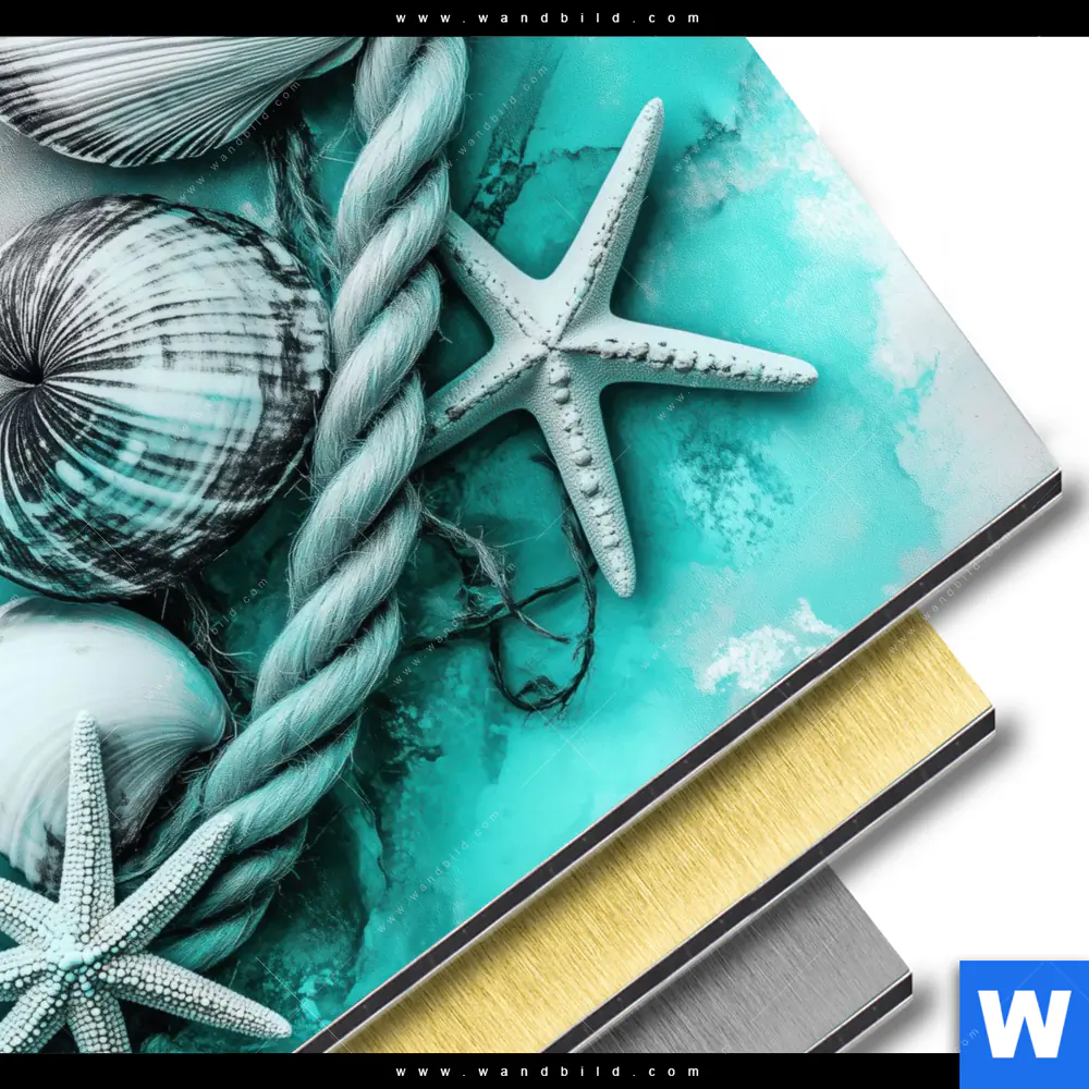 Aluminiumbild gebürstet | Muscheln-Meereszauber in Türkis | Quadrat