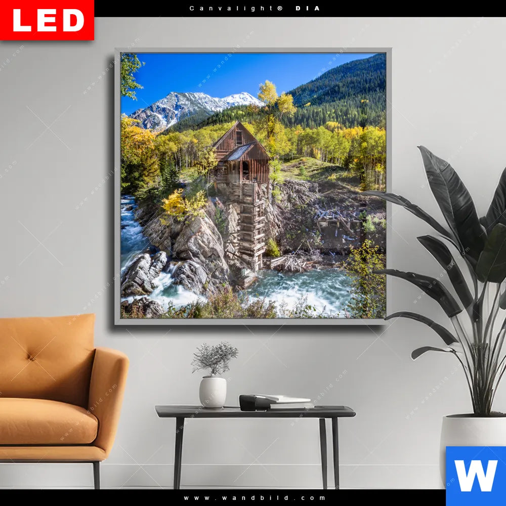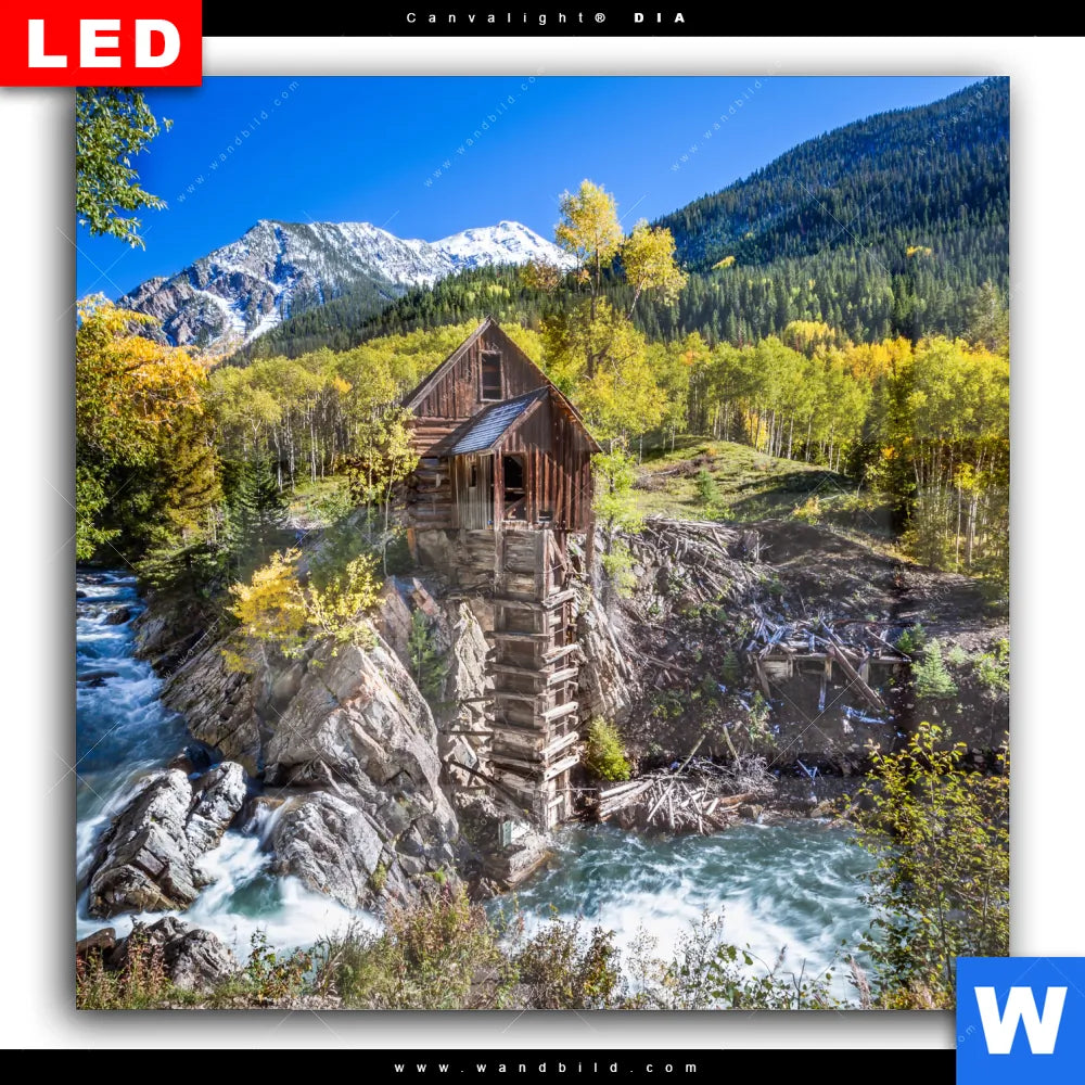 Wechselmotiv Acrylglas Canvalight® DIA | Waldhütte am Fluss | Quadrat