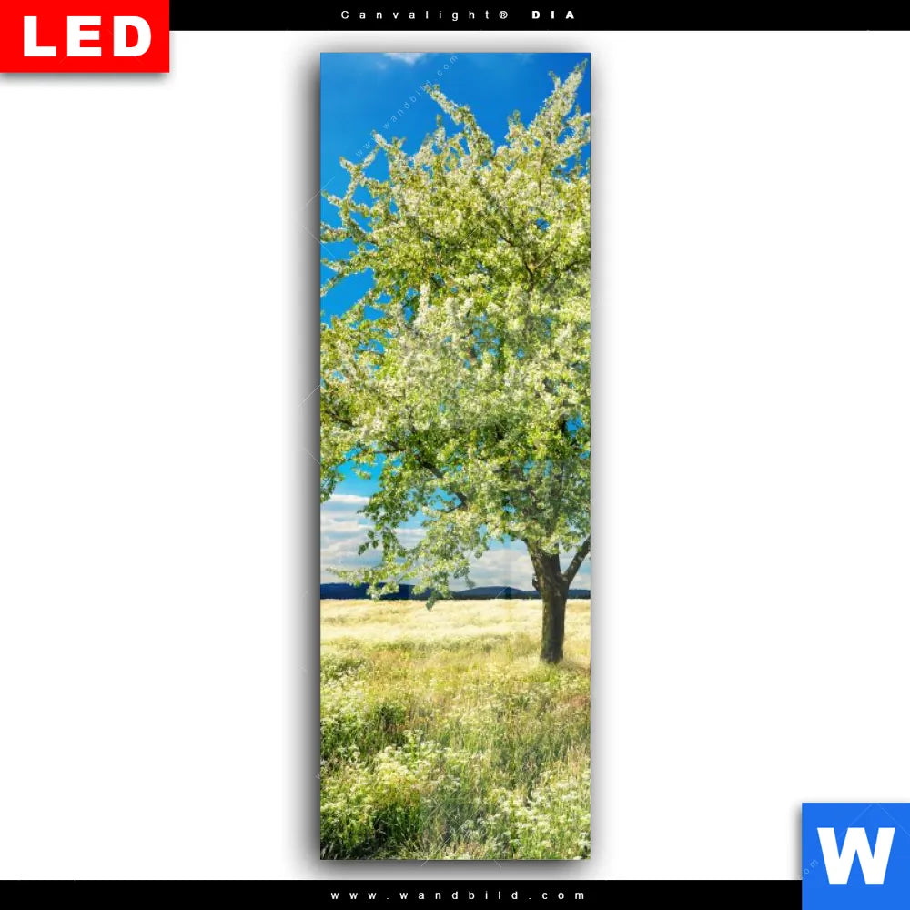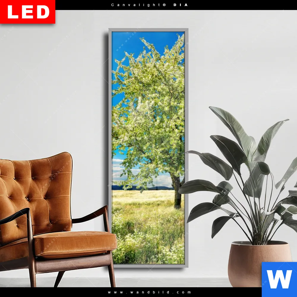 Wechselmotiv Acrylglas Canvalight® DIA | Wiese mit blühendem Baum | Schmal