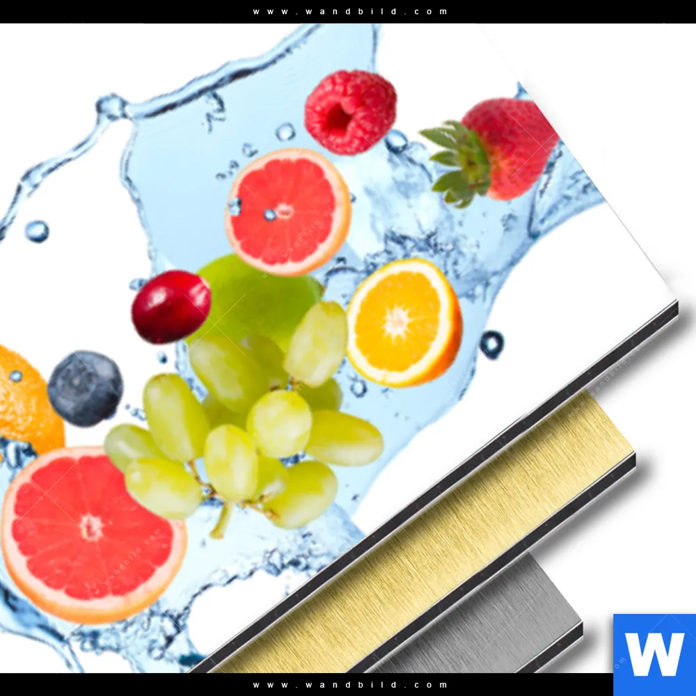 Aluminiumbild gebürstet | Früchte in Spritzwasser | Panorama