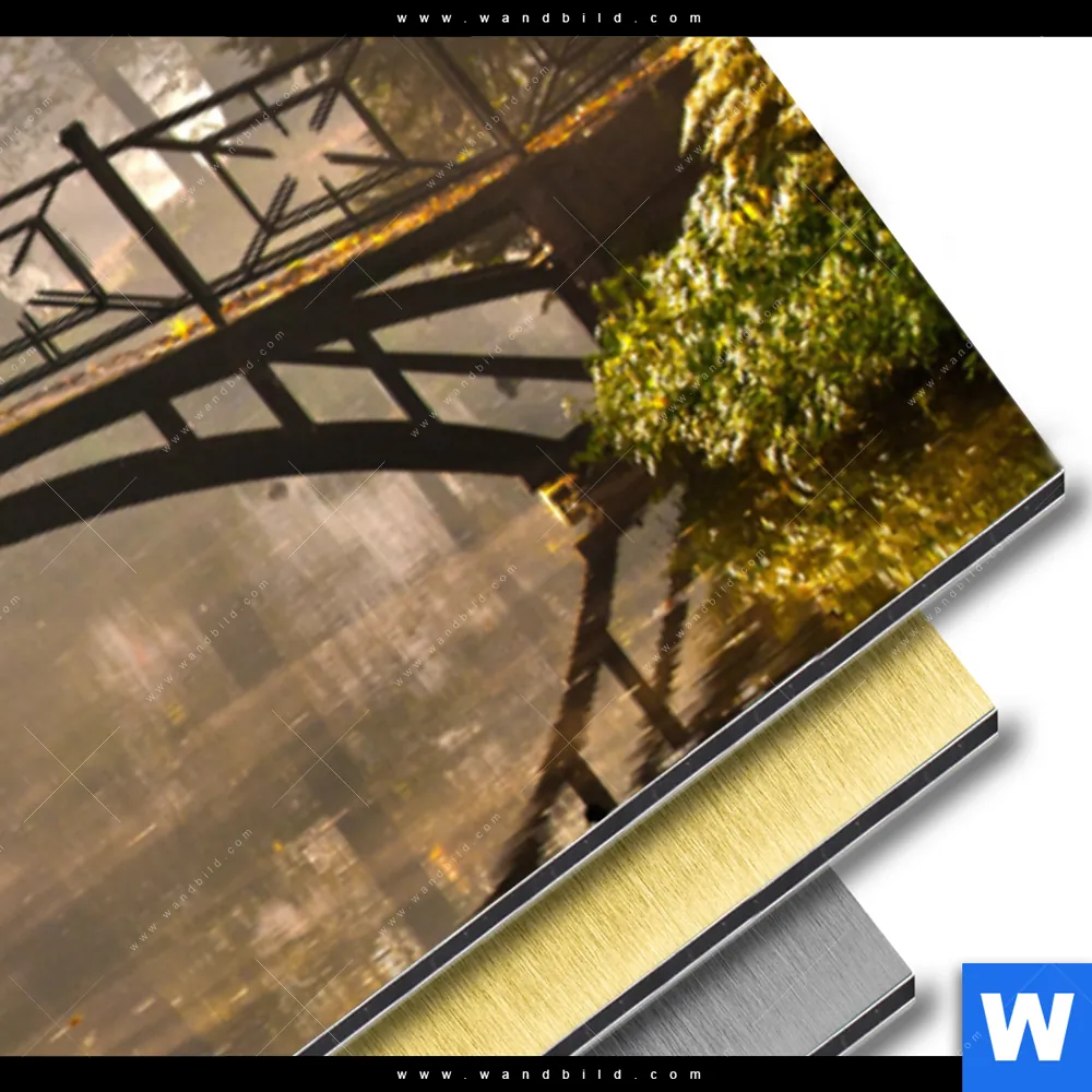 Aluminiumbild gebürstet | Idyllischer Wald mit Brücke | Panorama
