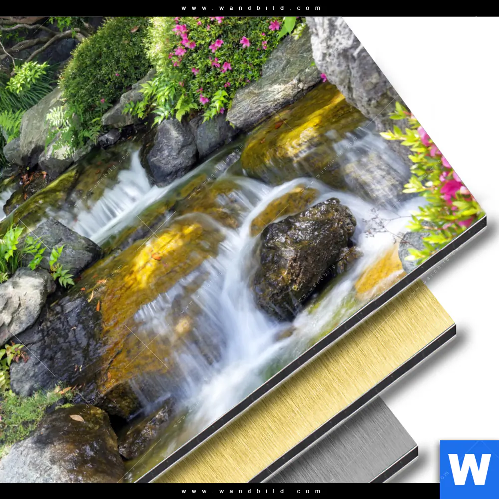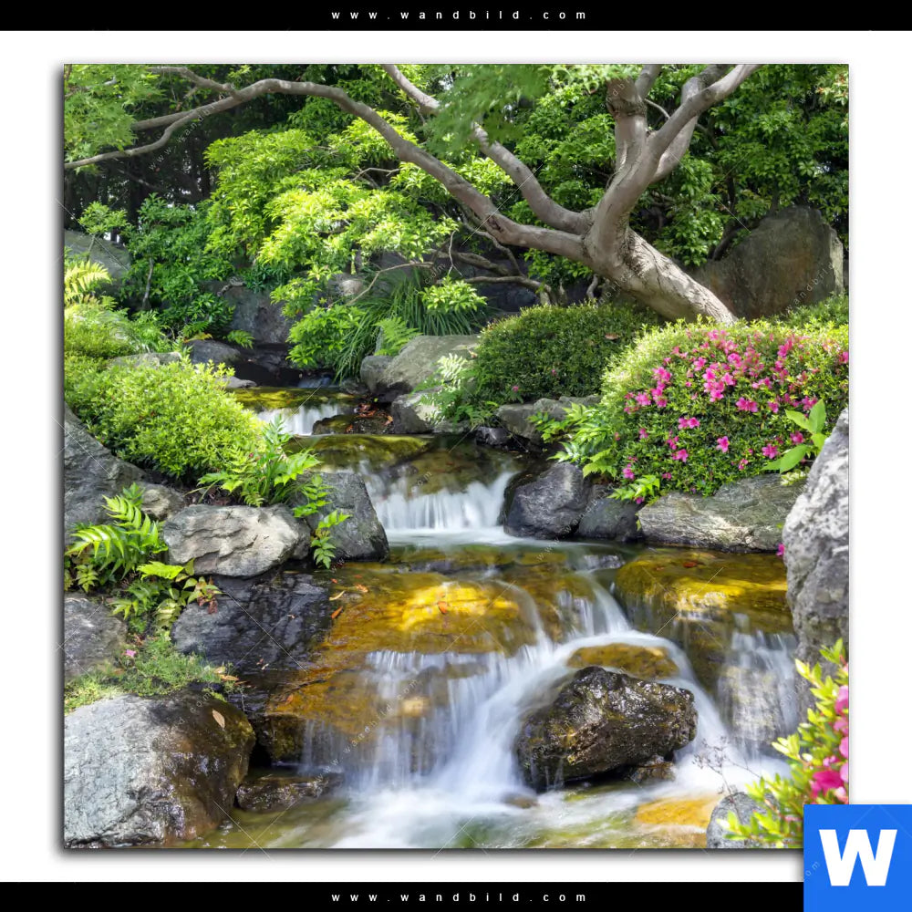 Aluminiumbild gebürstet | Japanischer Garten mit Wasserlauf | Quadrat