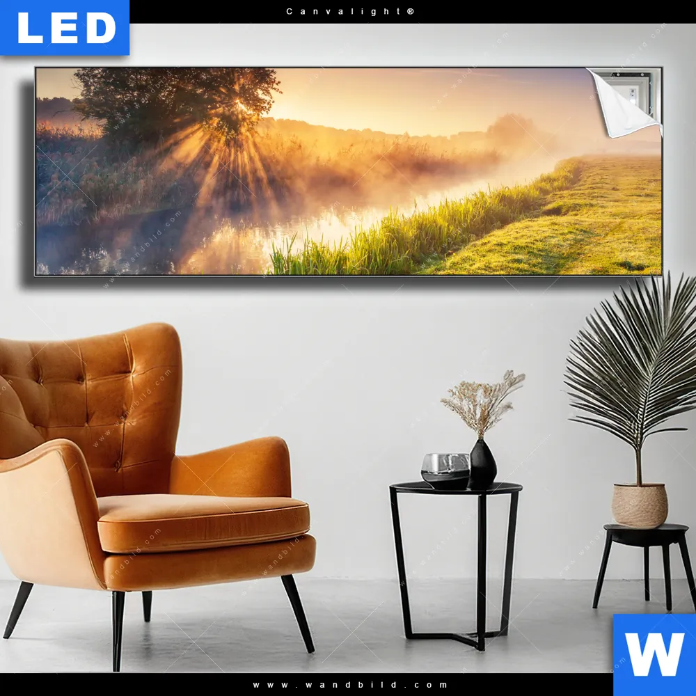 Canvalight® TEX Leuchtbild | Nebel am Fluss | Panorama