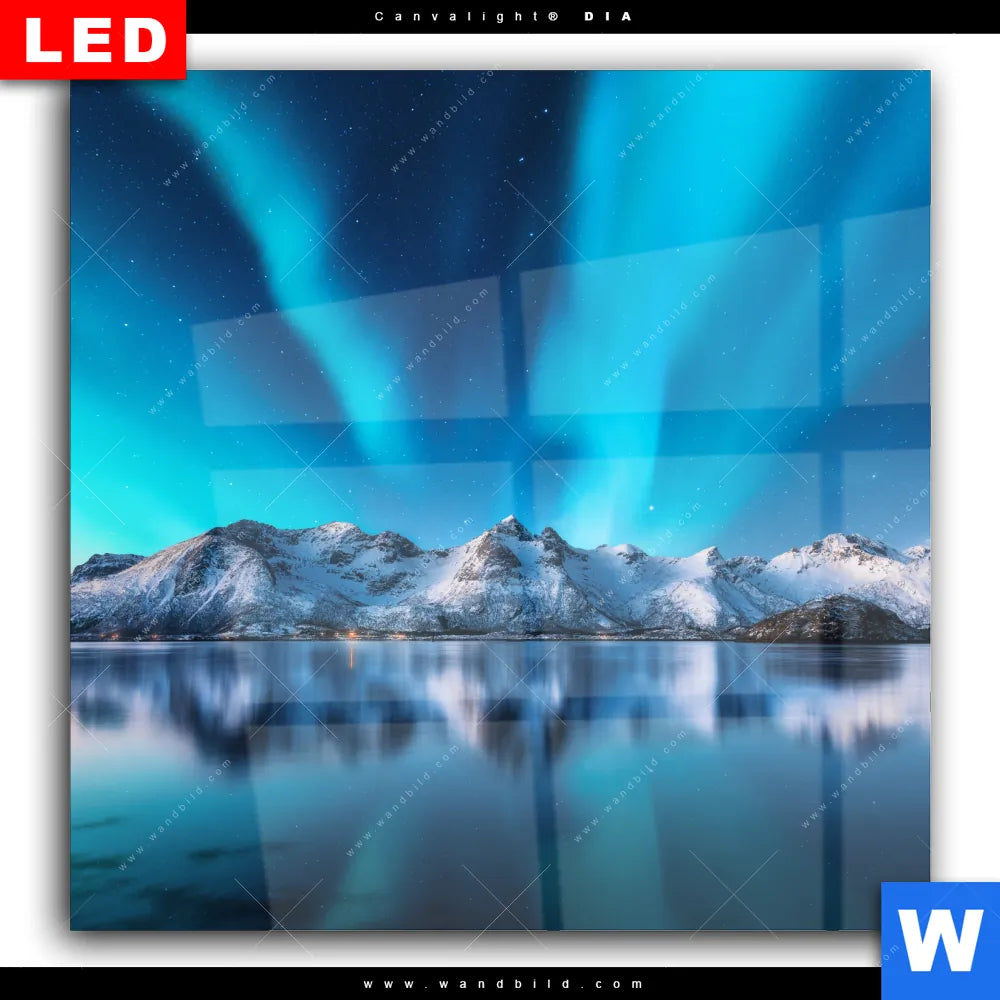 Wechselmotiv Acrylglas Canvalight® DIA | Nordlichter und schneebedeckte Berge | Quadrat