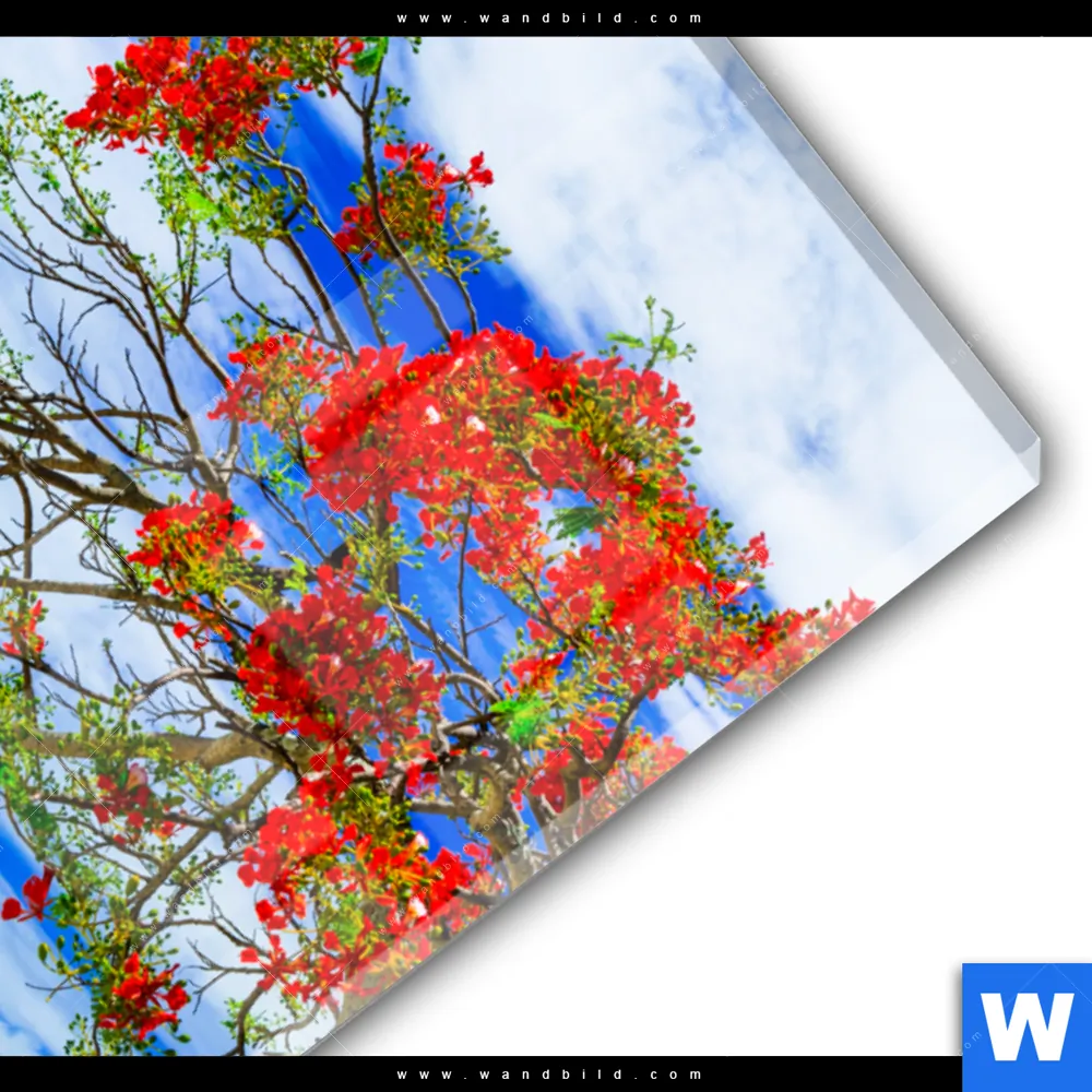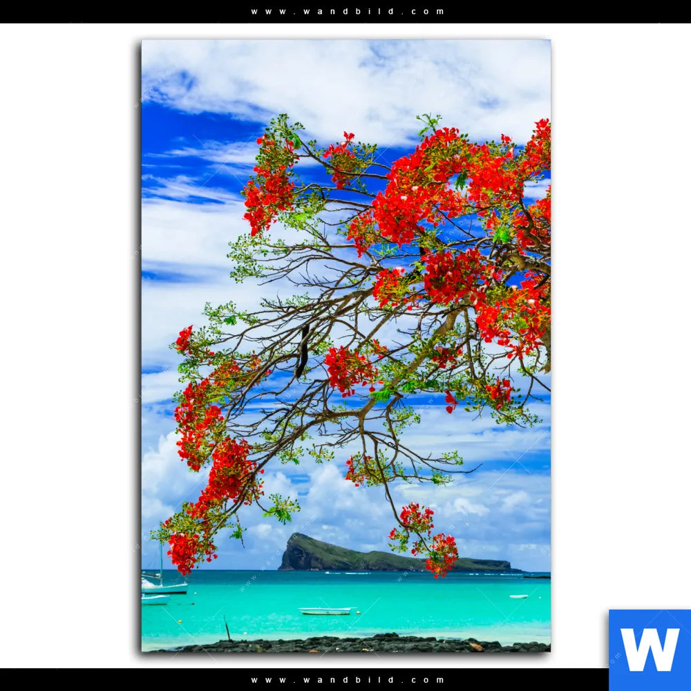 Acrylglasbild | Rote Blüten und Türkisfarbenes Meer | Hochformat
