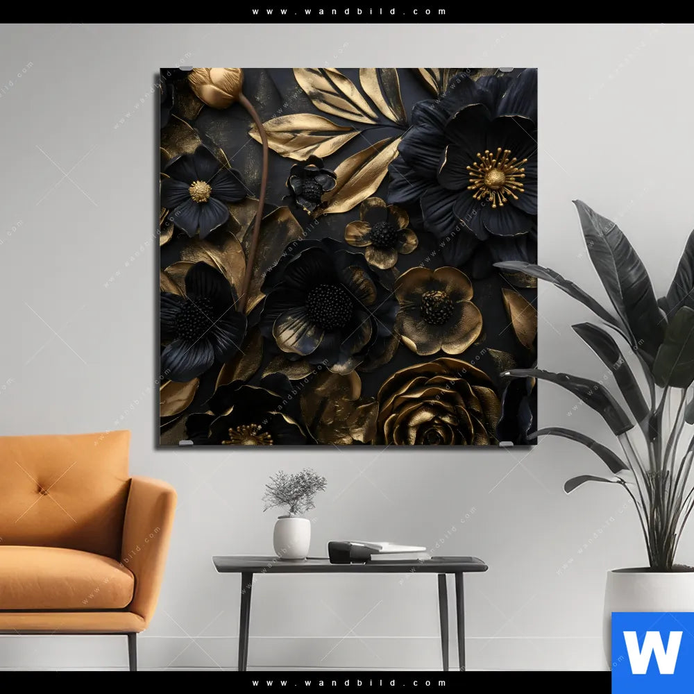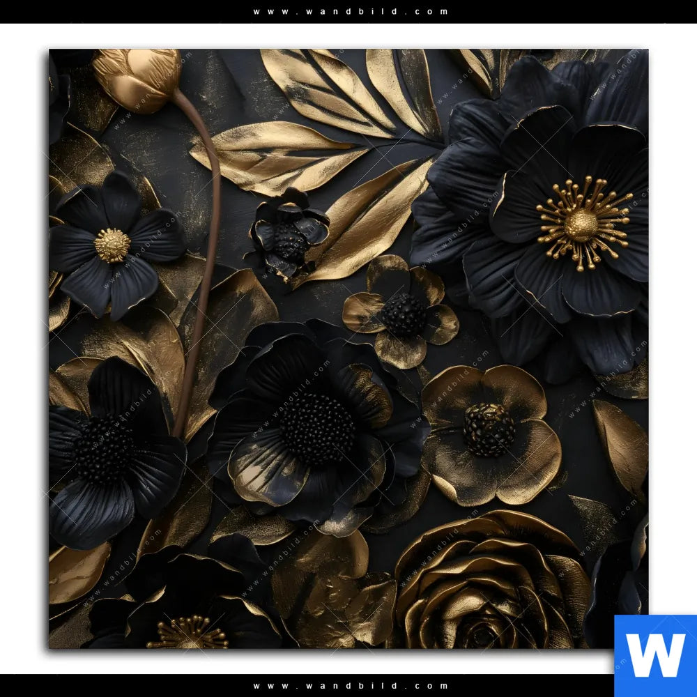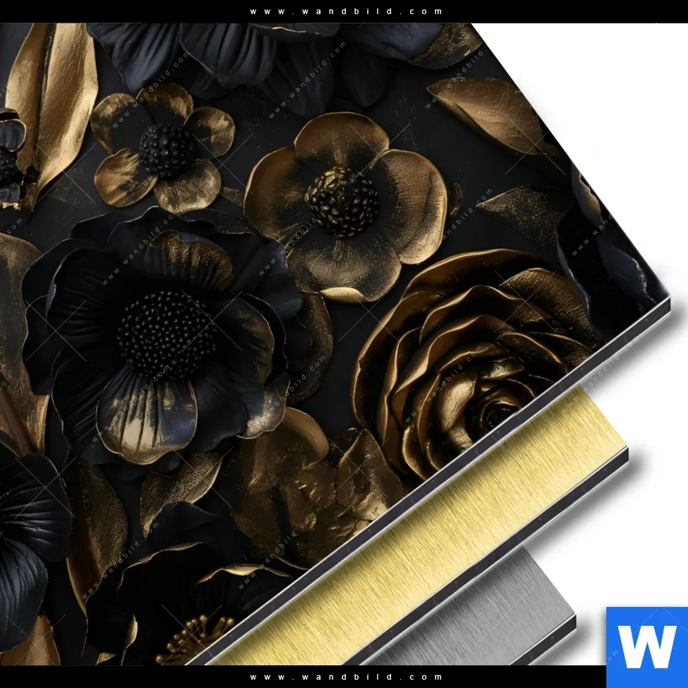 Alu-Dibond Bild | Schwarze und goldene Blüten | Quadrat
