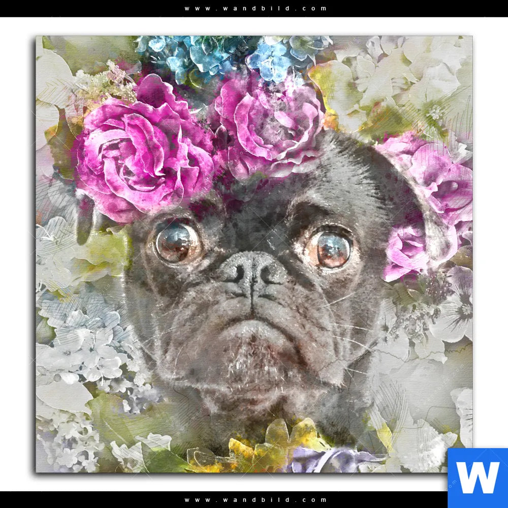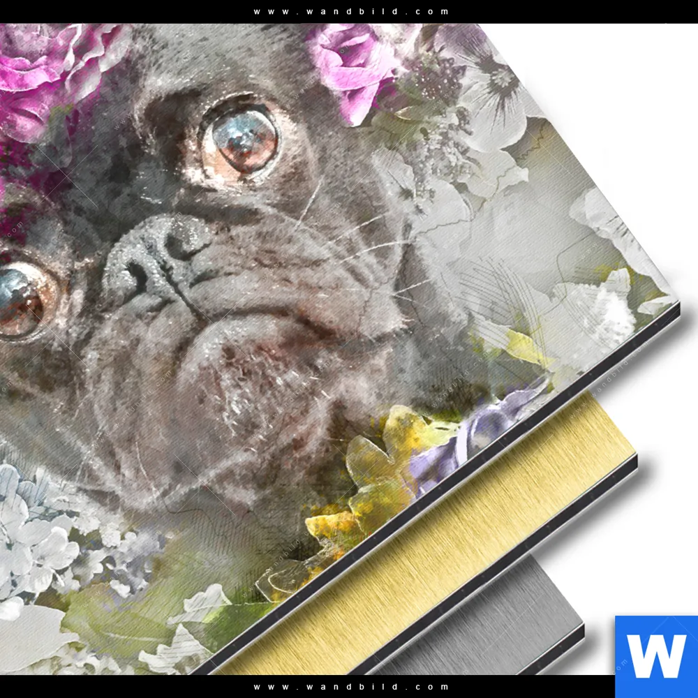 Aluminiumbild gebürstet | Mops & Blumen | Quadrat