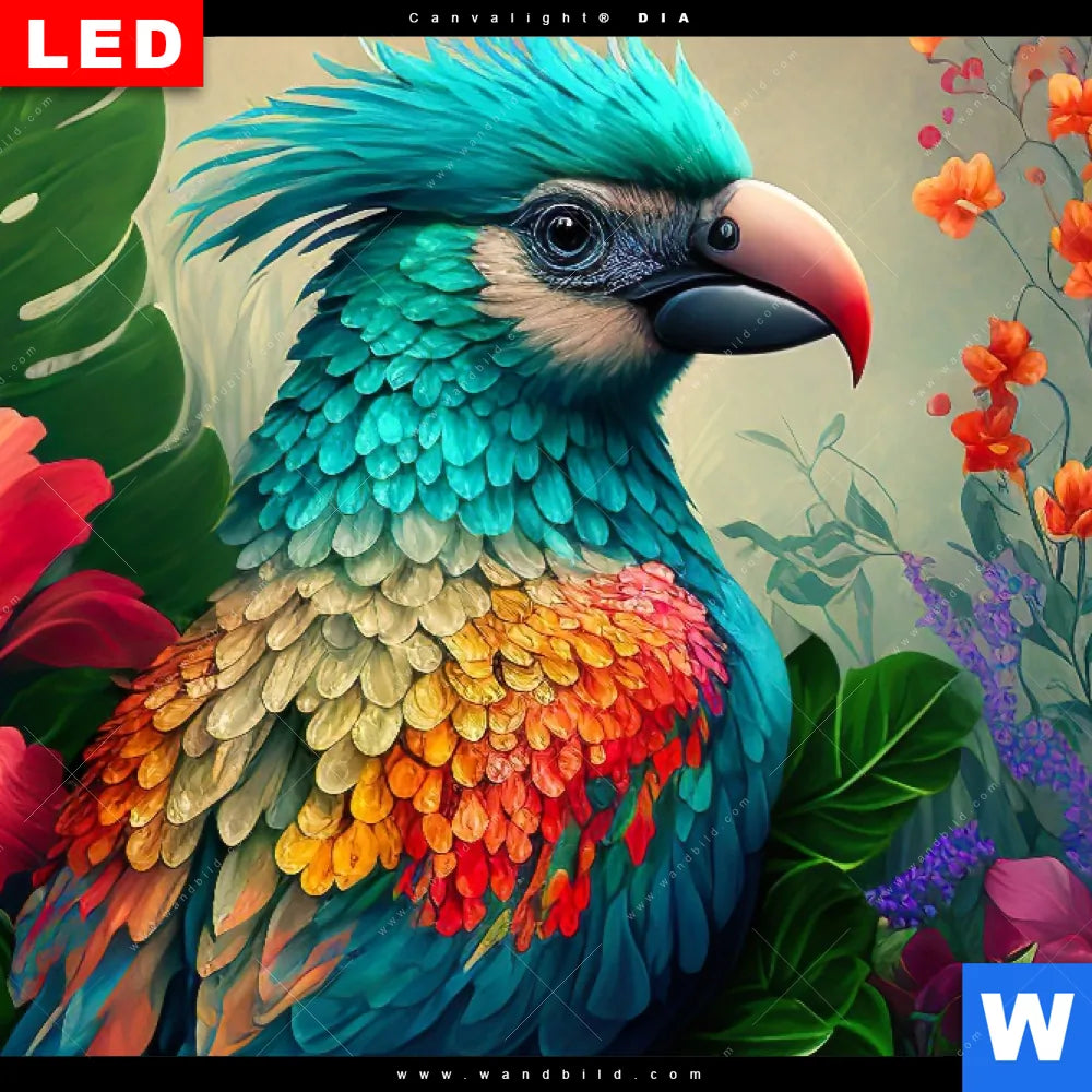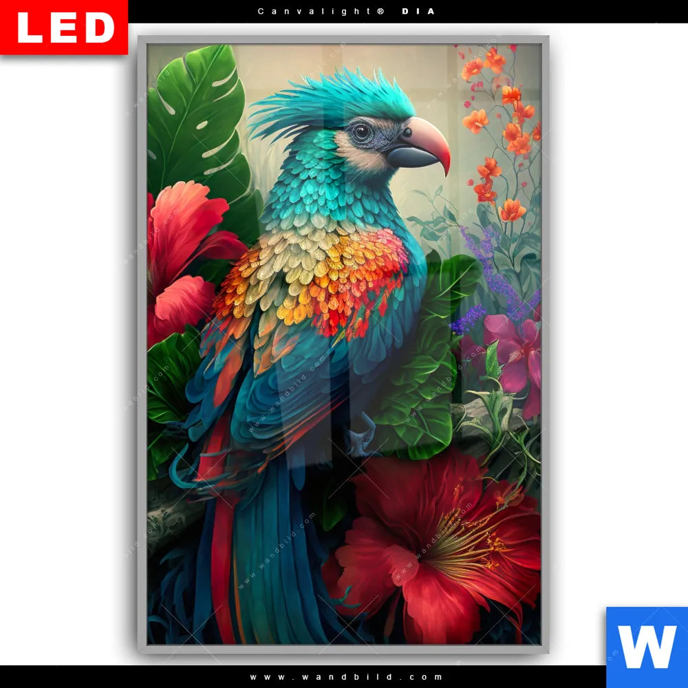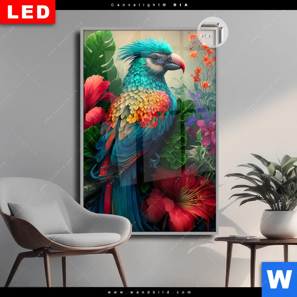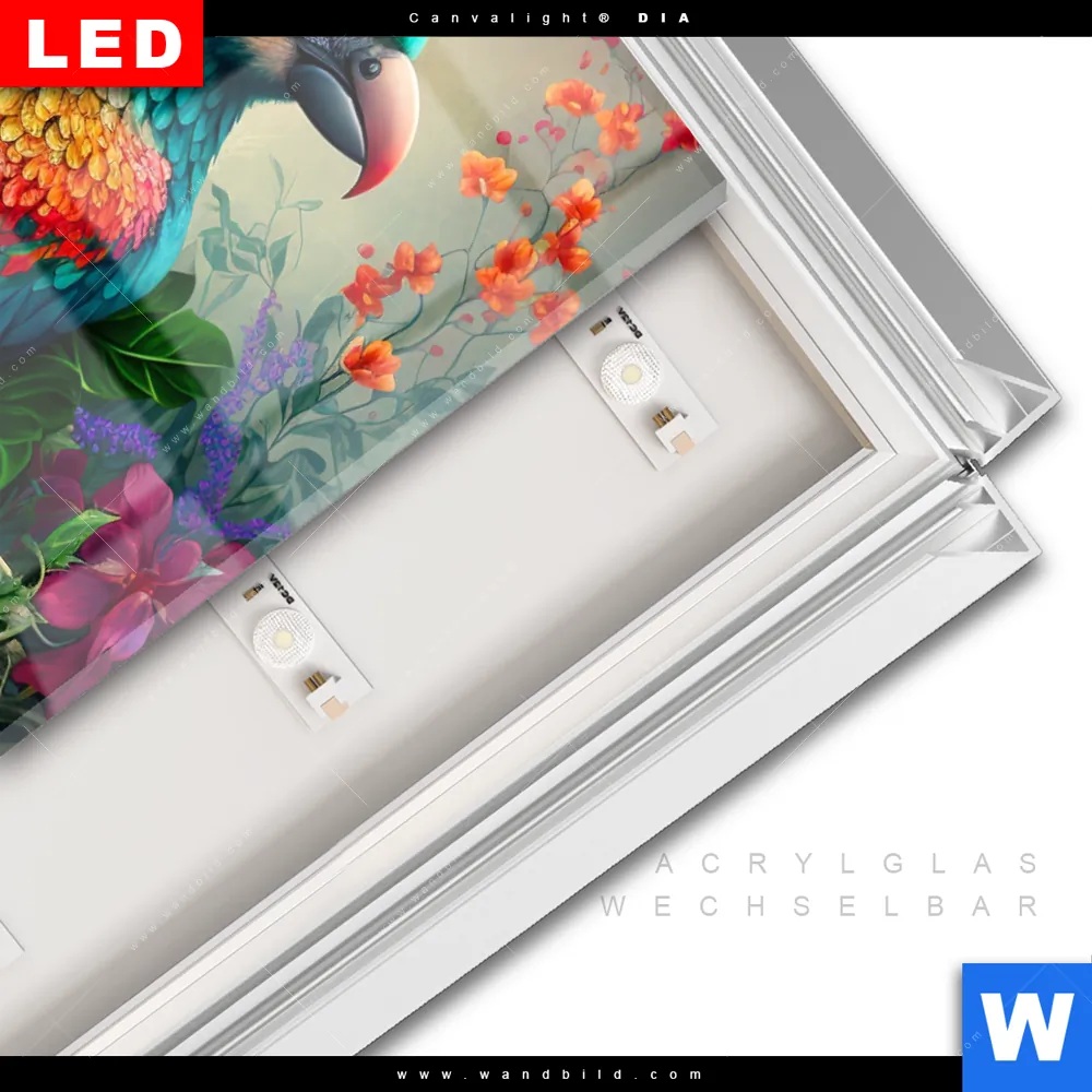 Canvalight® DIA Leuchtbild | Papagei und tropischer Hibiskus | Hochformat