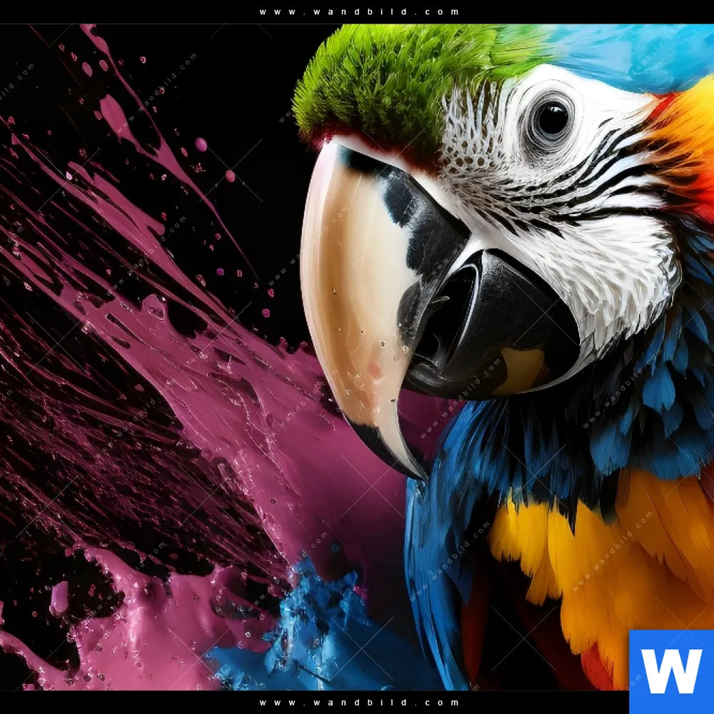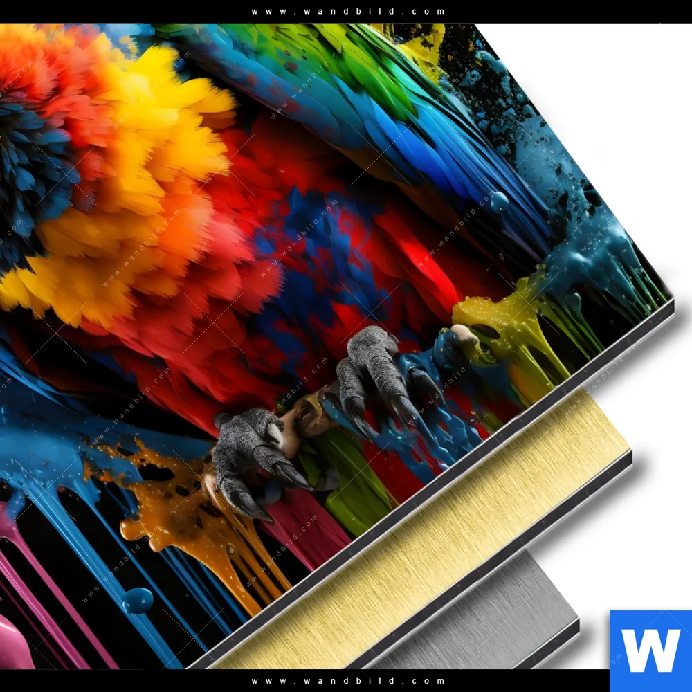 Alu-Dibond Bild | Papagei mit bunten Farbspritzern | Quadrat