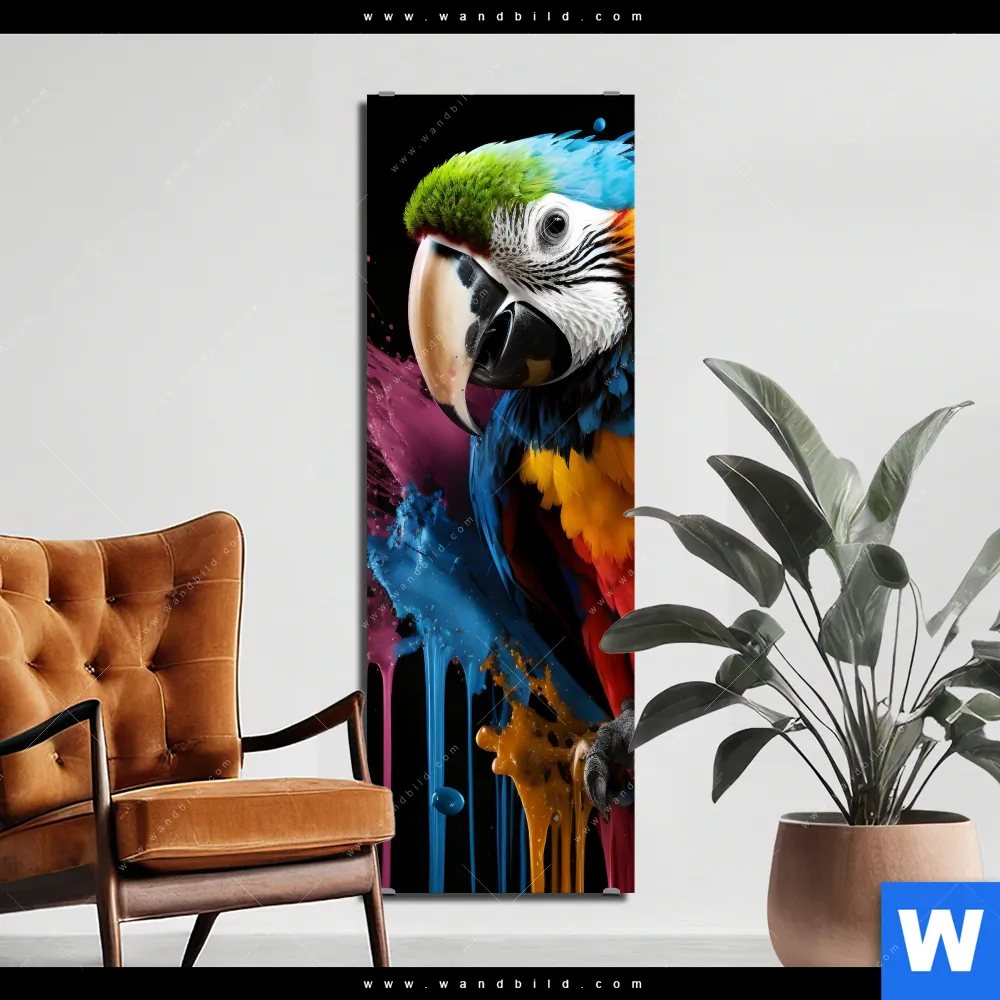 Alu-Dibond Bild | Papagei mit bunten Farbspritzern | Schmal