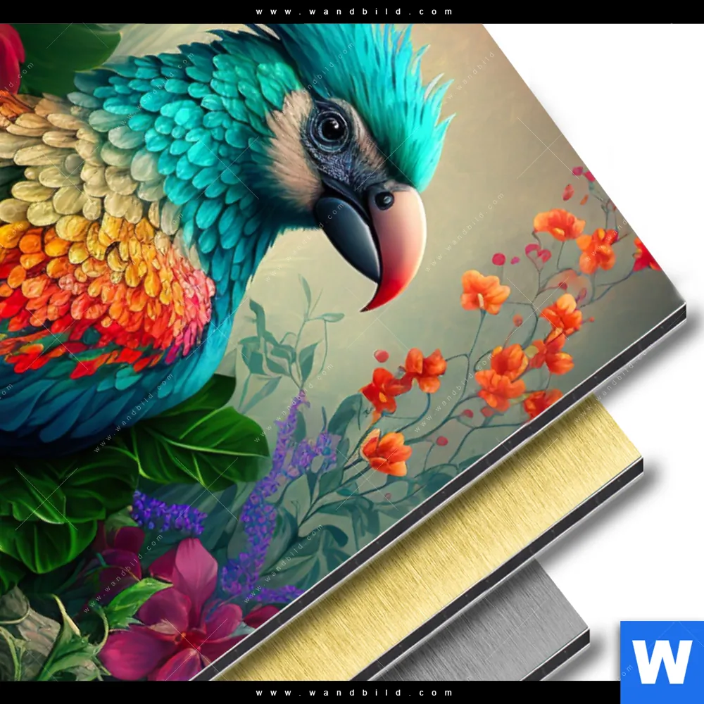 Aluminiumbild gebürstet | Papagei und tropischer Hibiskus | Hochformat